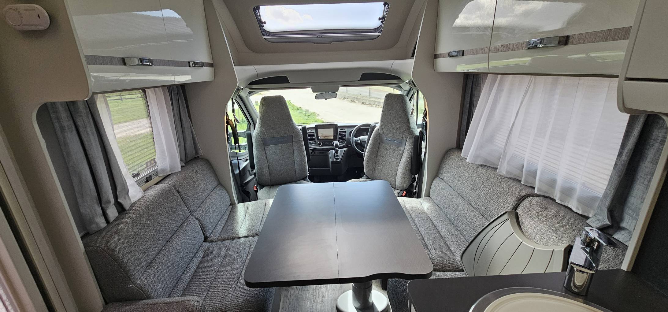 The front lounge features 2 side facing sofas in a stylish grey fabric that you can sprawl out on after your day's activities. When you are travelling these Aguti sofas cleverly transform into forward facing seats with seat belts meaning that 4 people can travel safely.