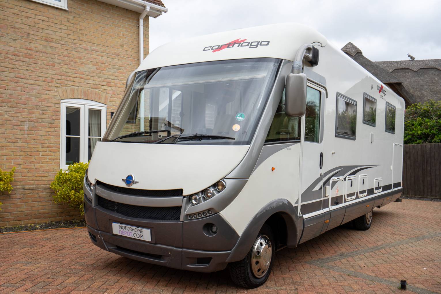 2012 Carthago Chic S-Plus I 52 – Luxury A-Class Motorhome (Rare Mercedes 3.0 V6 Automatic) Queen fixed Island Bed to the rear over a large rear garage with drop down double transverse bed over the drivers cabin. L Shaped Lounge. 4 Seat Belts.