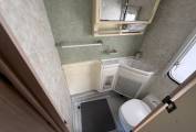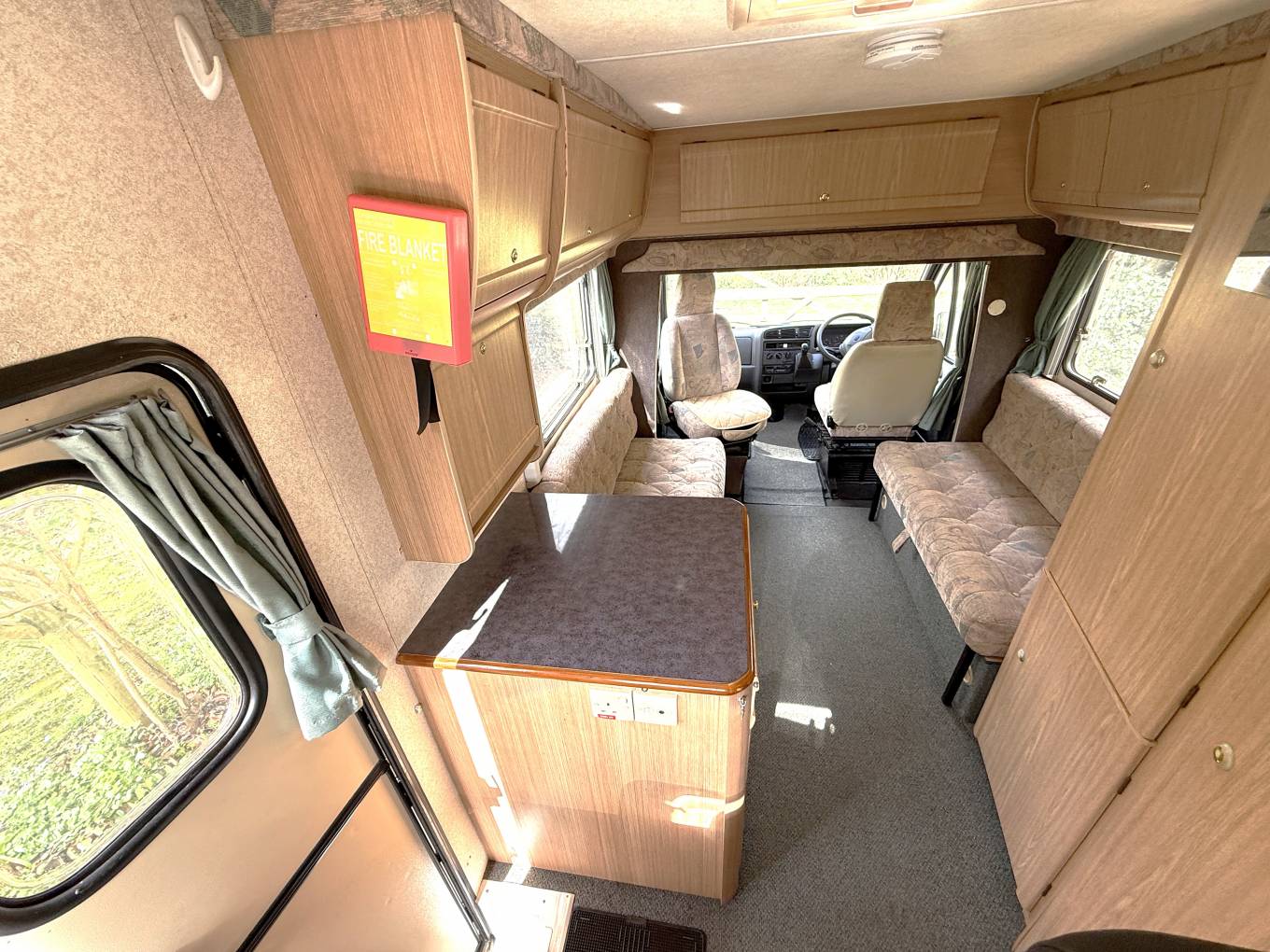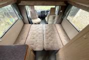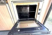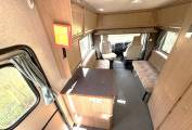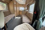 Two berth layout with two belted travel seats. Cab features two swivel front seats. The living area includes a washroom with shower and cassette toilet. Kitchen equipment consists of a three way fridge, two gas hob burners, separate fish or griddle burner, and an oven. Storage includes wardrobe hanging space, under seat storage and multiple overhead and integrated compartments.