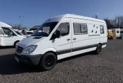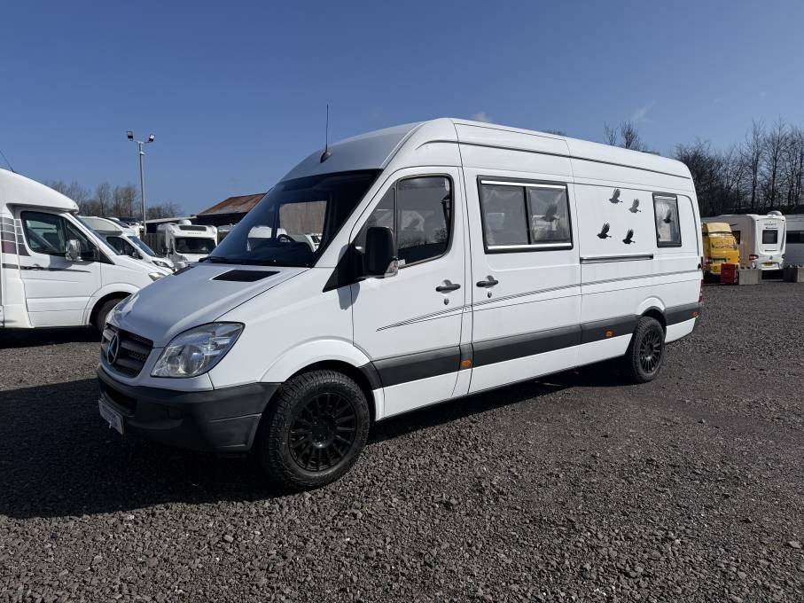 Motorhome Depot Glasgow is delighted to have for sale this very rare to the Scottish market Mercedes Benz Long Wheelbase Sprinter 2 Berth professionally converted campervan. This individual campervan has a unique bench seated lounge that converts into a double bed with at its rear having a full kitchen and bathroom.
