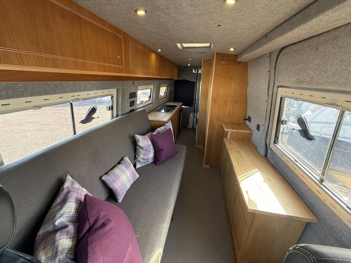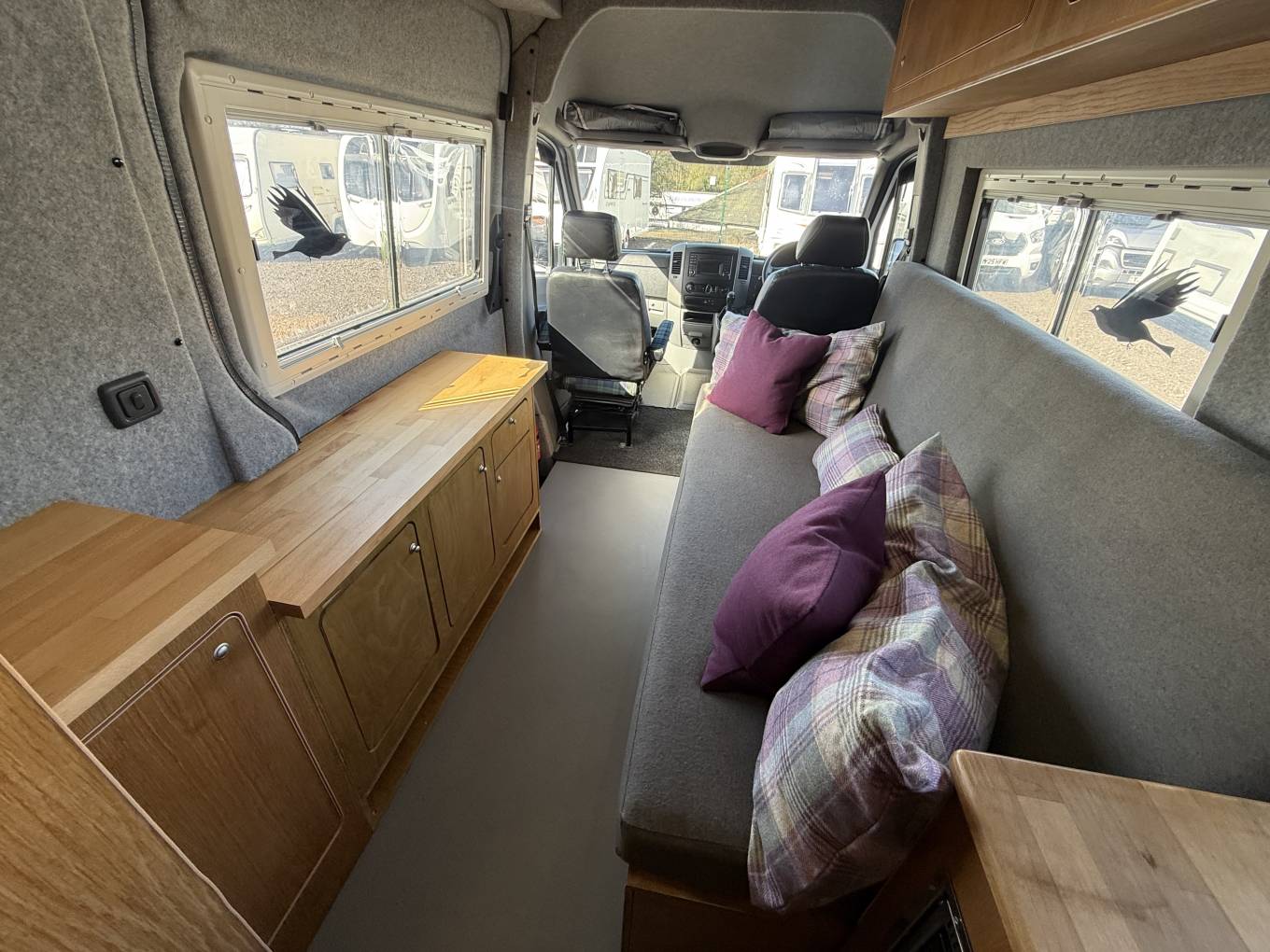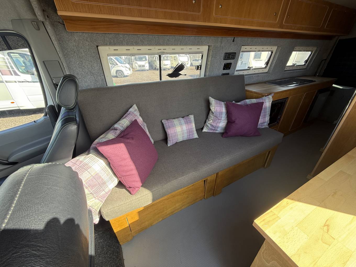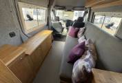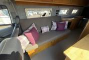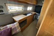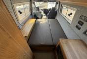 The layout is from the habitation door you enter the open plan lounge area which has a driver side long bench seating area which converts easily at night to make a double bed. The front passenger cab seat swivels easily to create extra seating space and there are overhead lockers for storage space and across from the bench seat is a good sized sideboard for storing holiday items.