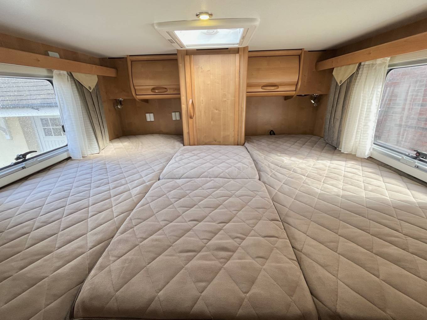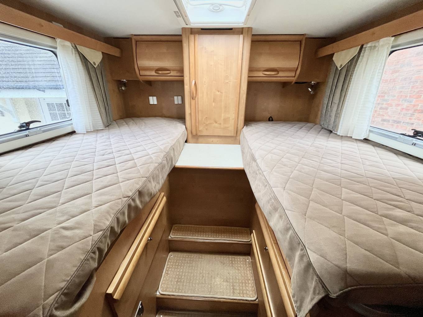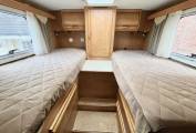 The rear bedroom consists of two fixed single beds with the option to convert to a large double using the infills provided, again good storage with a good sized hanging wardrobe, two overhead lockers and 3 good sized drawers under the beds.