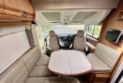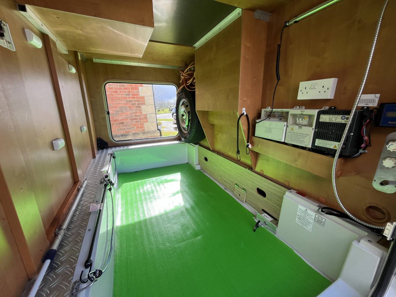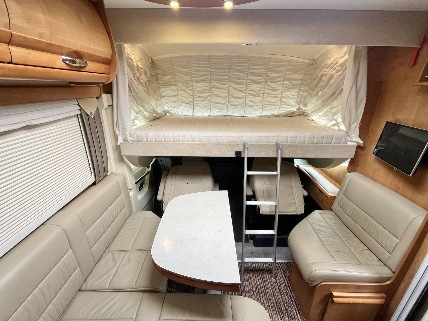 The well-equipped and spacious cab features cruise control, cab air conditioning, twin view rear camera, Garmin sat Nav with built in dash-cam, radio CD player and cab/windscreen blinds, above the cab area is a large double drop down bed.