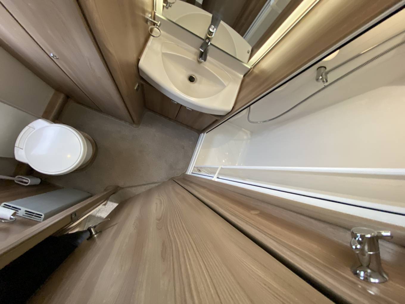 Washroom: A full-width rear washroom offering excellent space, including a large sink with mirror, main wardrobe storage, cassette toilet and a separate shower cubicle.