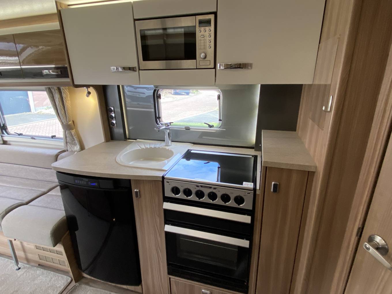 Kitchen: Well-equipped with a gas cooker (hob, oven and grill), microwave, sink and a 3-way fridge/freezer, along with generous storage throughout.