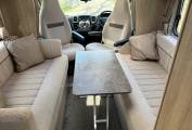 In the centre of the motorhome is the spacious lounge consisting of two Inward Facing Settees and twin Swivelling Cab Chairs. A removable table sits in the centre for dining.