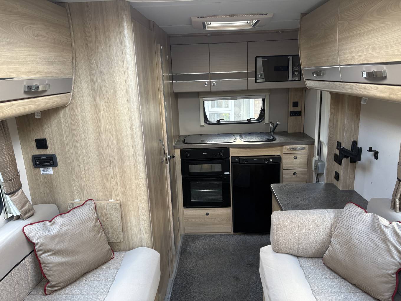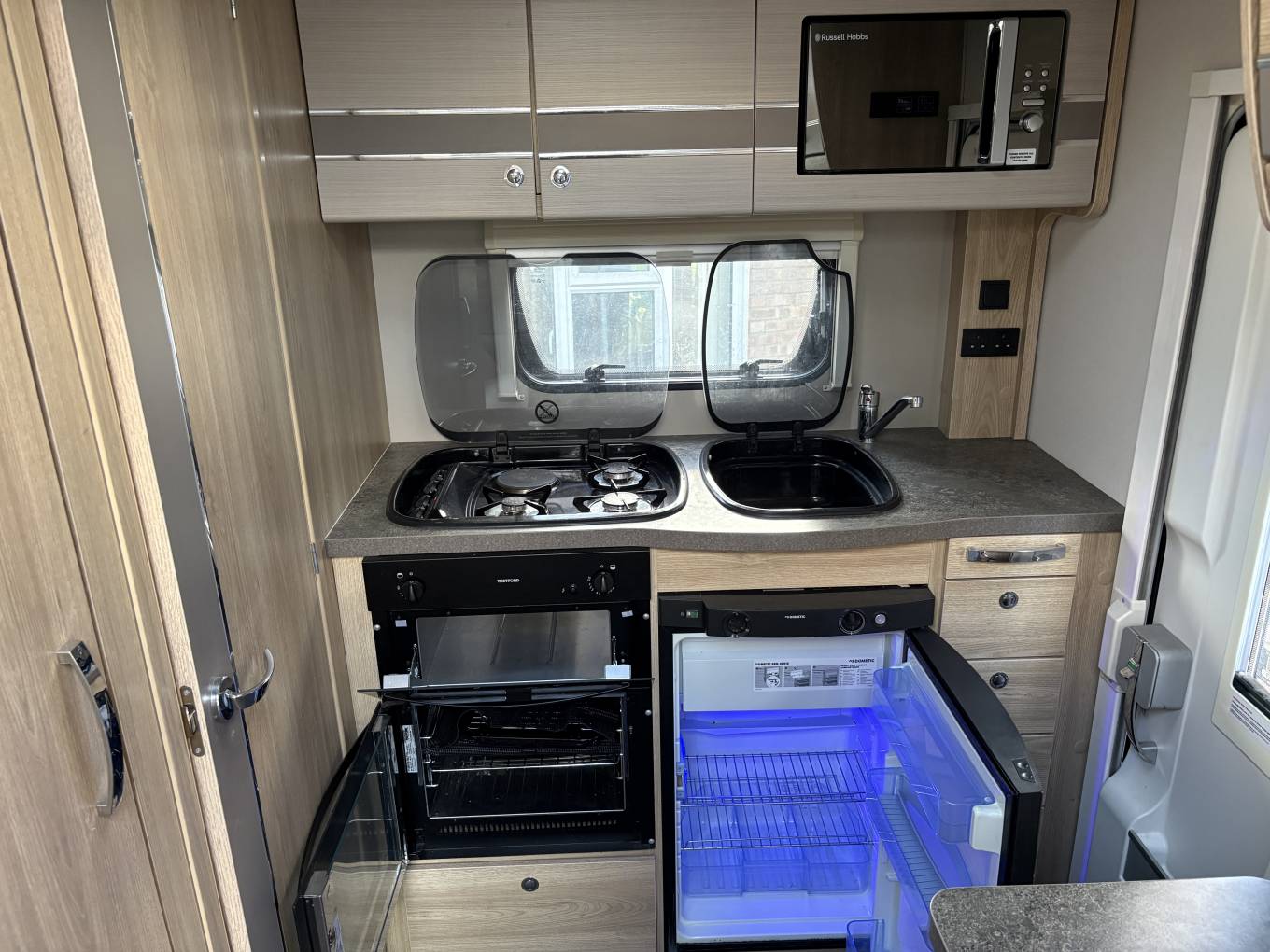 Here you will find a Three Gas Burner and one Electric Hotplate Hob, a separate Oven and Grill, 3-way Dometic Fridge freezer, a Microwave Oven, Sink with a Hot & Cold Mixer Tap and removable drainer.