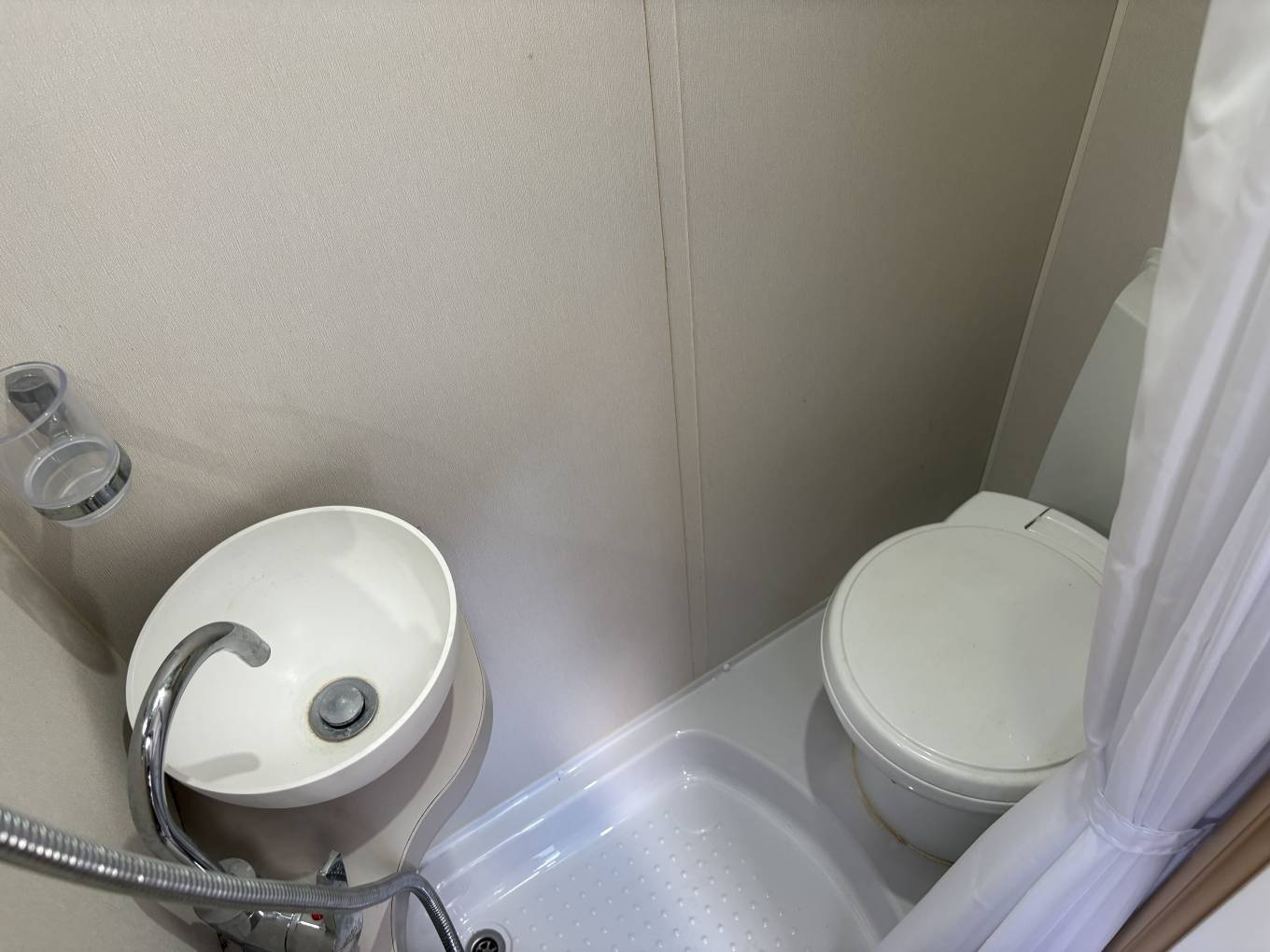 In the far corner from the entrance is the wetroom style bathroom consisting of a Thetford Flush Cassette Toilet, a Wash Handbasin and a Shower Unit.
