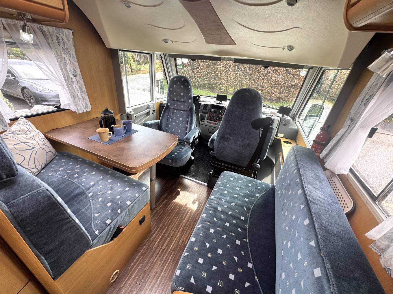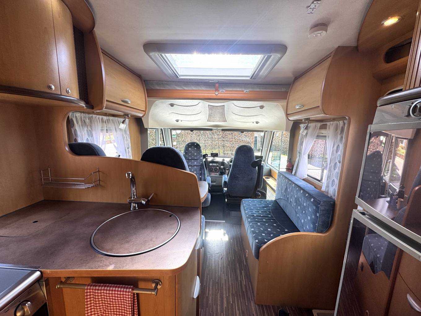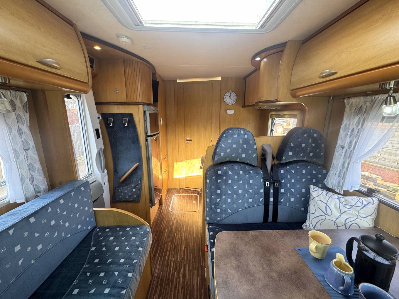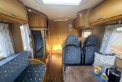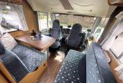 Inside, the layout is both practical and inviting. The front dinette creates a bright and sociable space for dining or relaxing, with plenty of natural light giving the area an open feel. Above the cab and lounge area, there is a convenient drop-down bed, providing additional sleeping space without compromising the main living area.