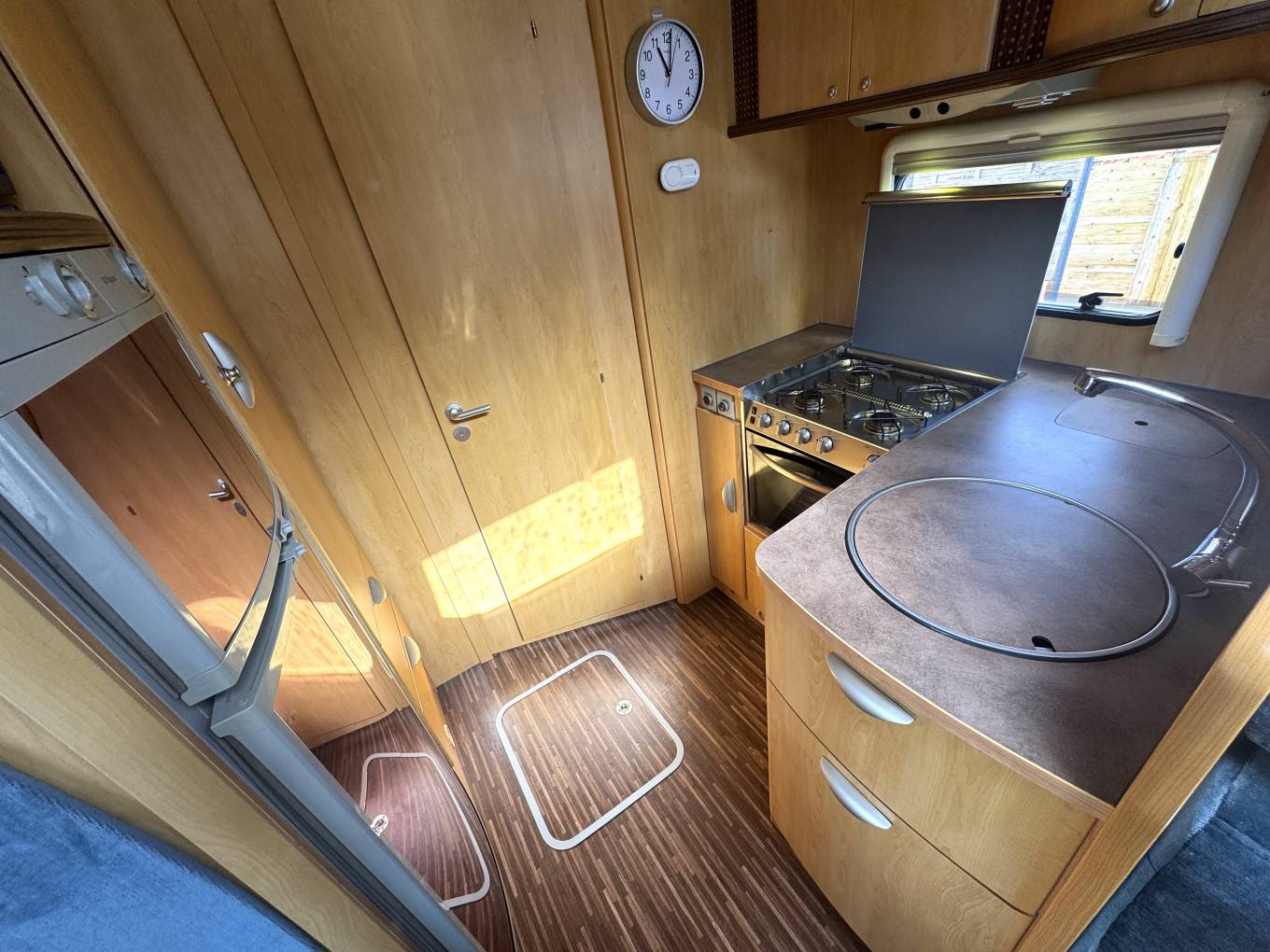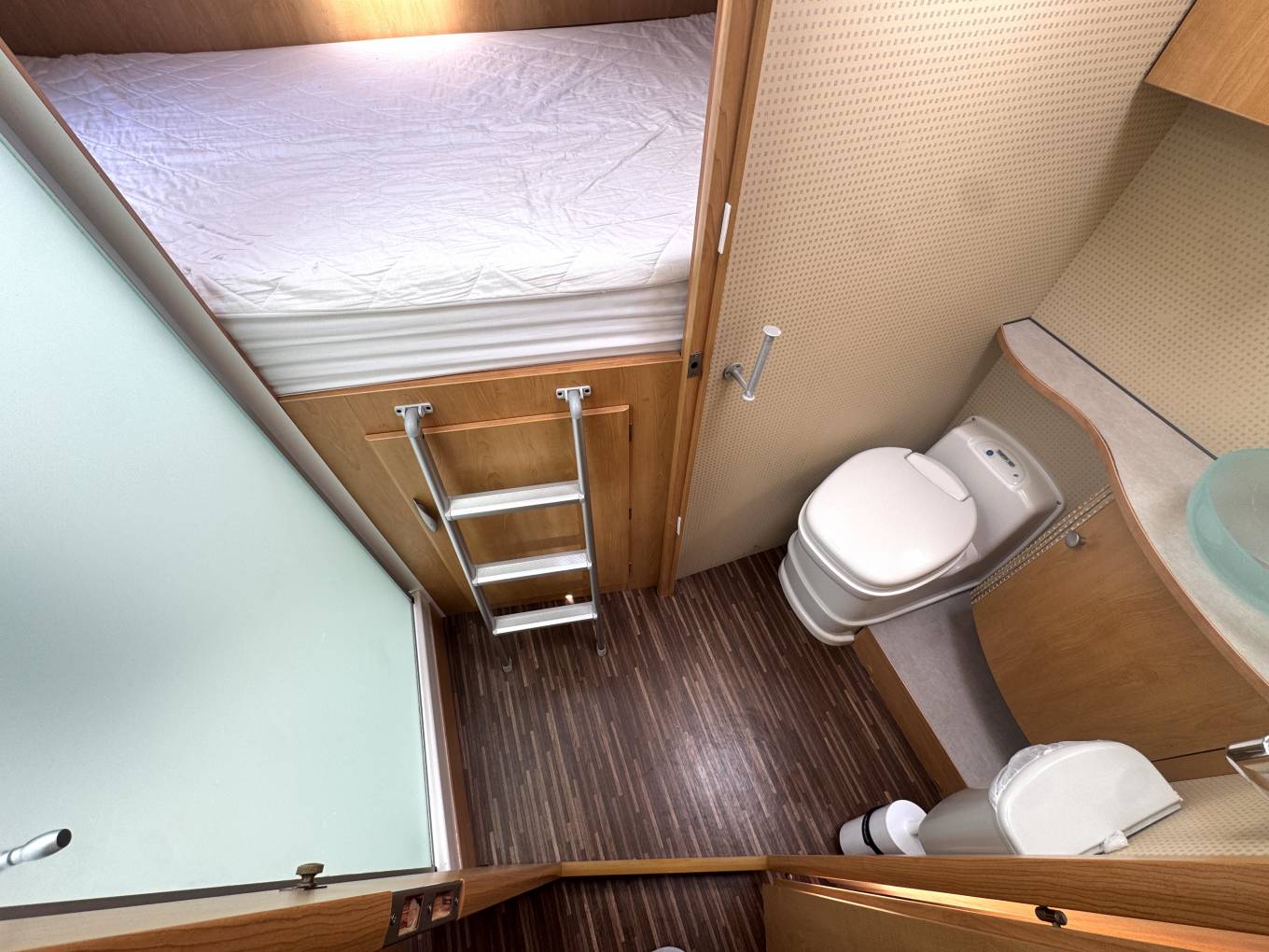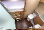 Moving into the centre of the vehicle, the washroom arrangement is a real highlight. The clever design allows the toilet door to swing across, creating a private en suite setup that separates the bathroom area from the main living space, offering added comfort and usability.