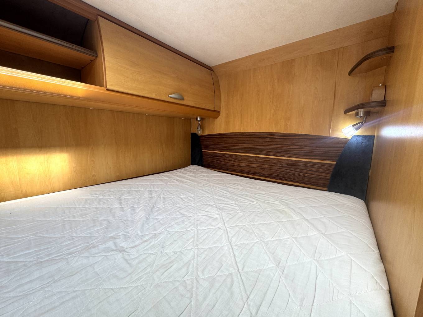 To the rear, the fixed transverse bed sits above a large garage, providing a comfortable and permanent sleeping area while also delivering excellent storage capacity for outdoor equipment and travel essentials. The garage is easily accessed and adds real practicality for longer trips.