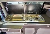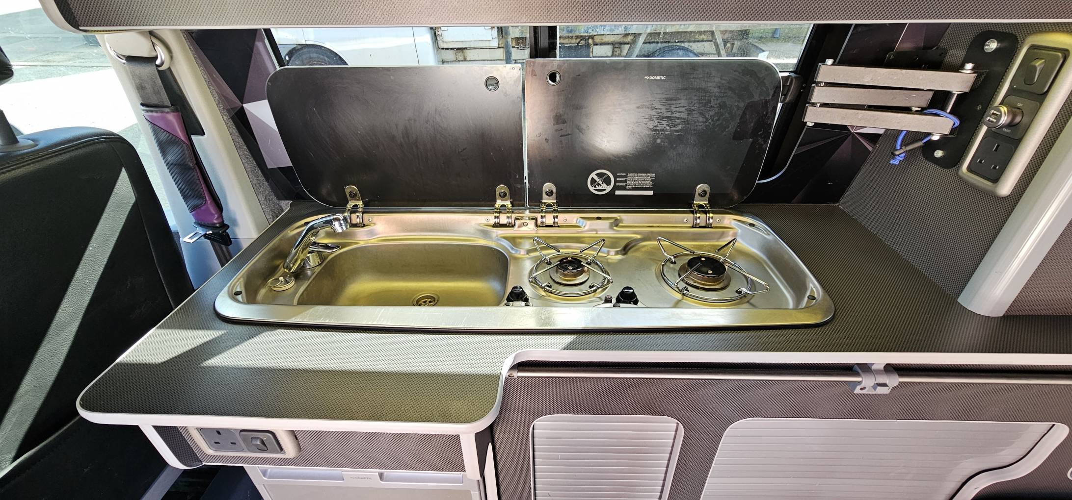 The kitchen area includes a Dometic fridge along with a hob and sink, while gas heating helps keep the interior comfortable in cooler conditions.