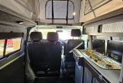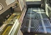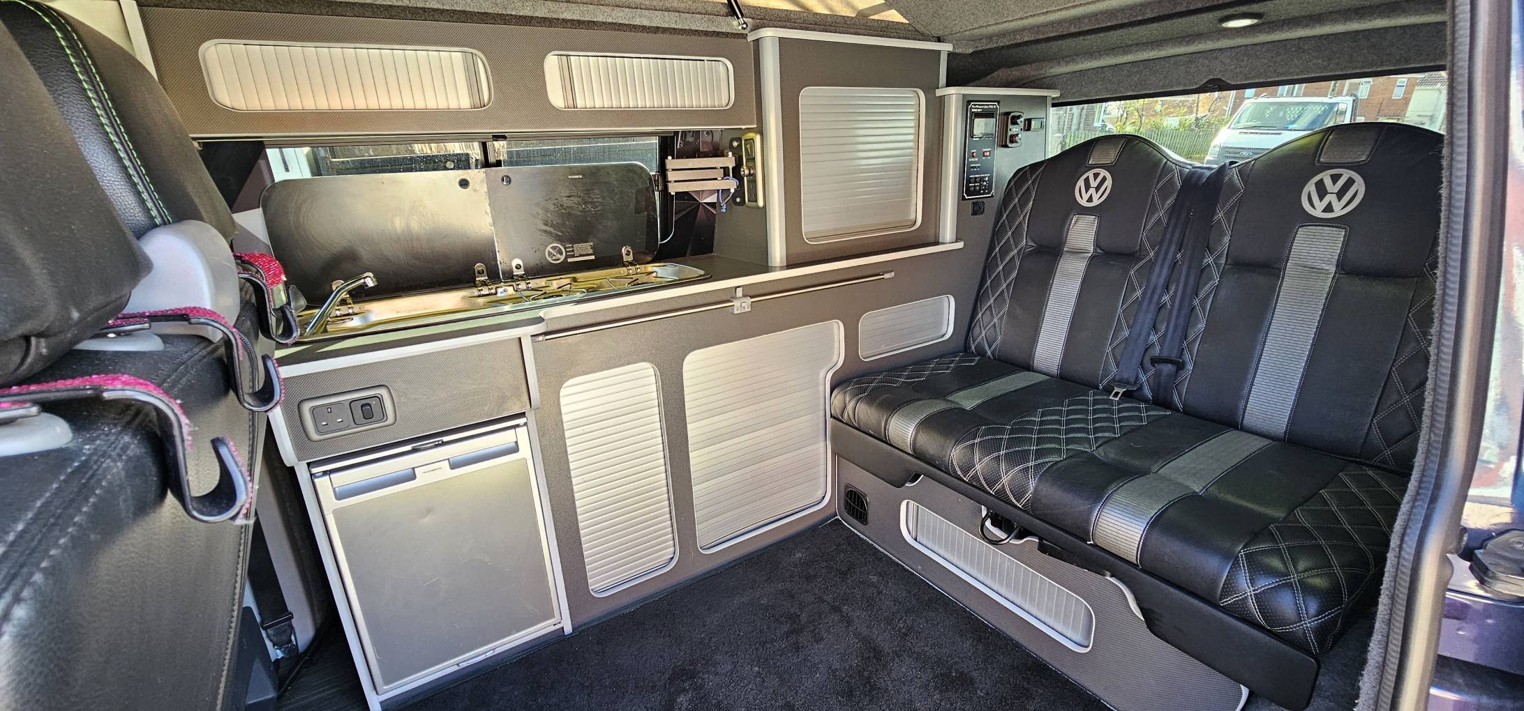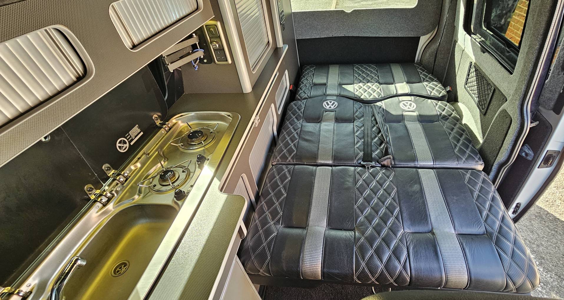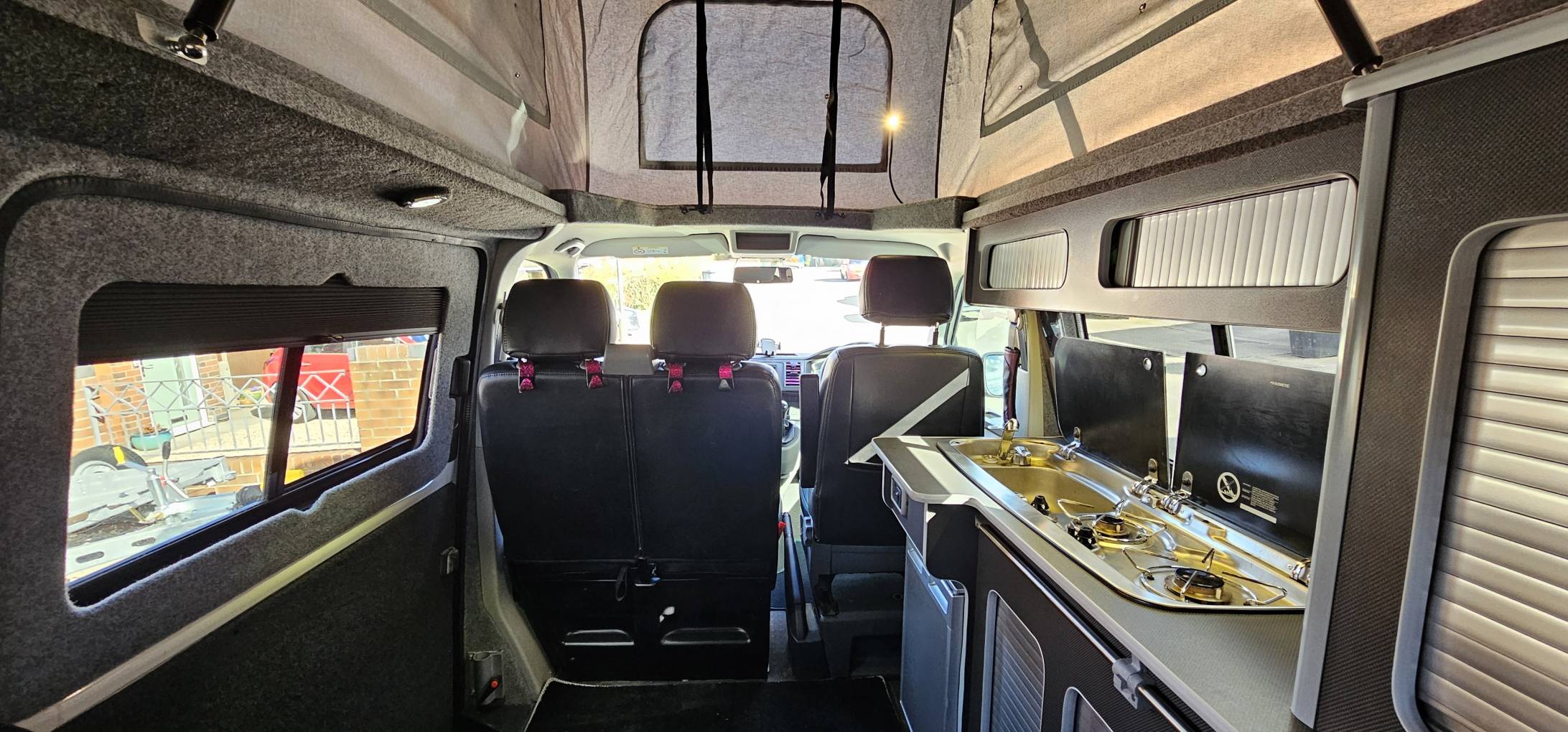 Inside, the layout provides seating and sleeping for up to four people, with five travelling seatbelts. The front cab seats swivel to create a sociable living space, while the rock and roll bed converts easily into a sleeping area, with an additional bed located within the pop-top roof.