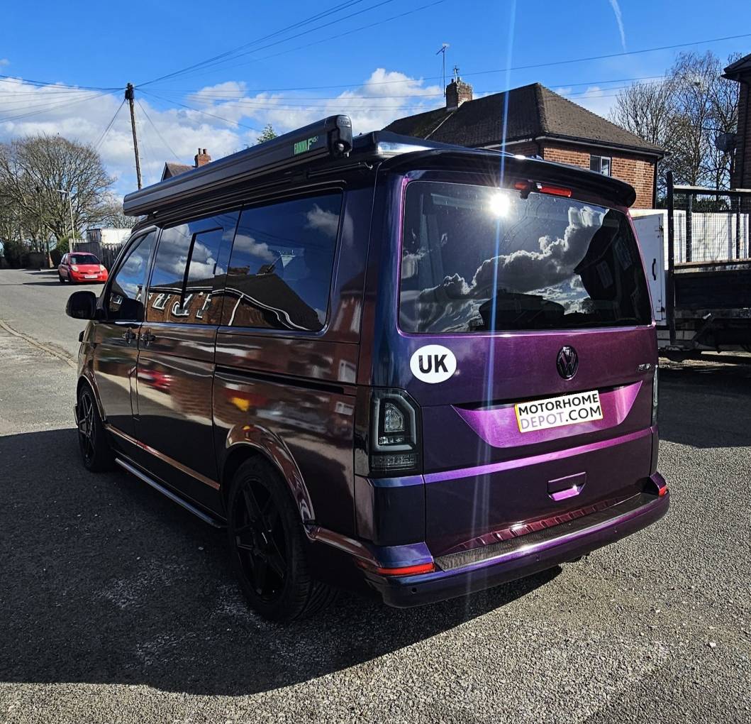 The vehicle has been professionally wrapped to protect the original paintwork, which remains white underneath, and is registered with the DVLA as a Motorcaravan.