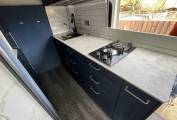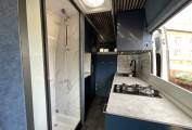 To the centre of the camper, you will find the compact washroom which provides a Thetford cassette toilet and shower. The kitchen area is adjacent and is extremely well-equipped offering a sink with hot and cold water, 2 ring gas hob, microwave and fridge freezer, with ample storage cupboards..