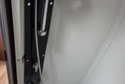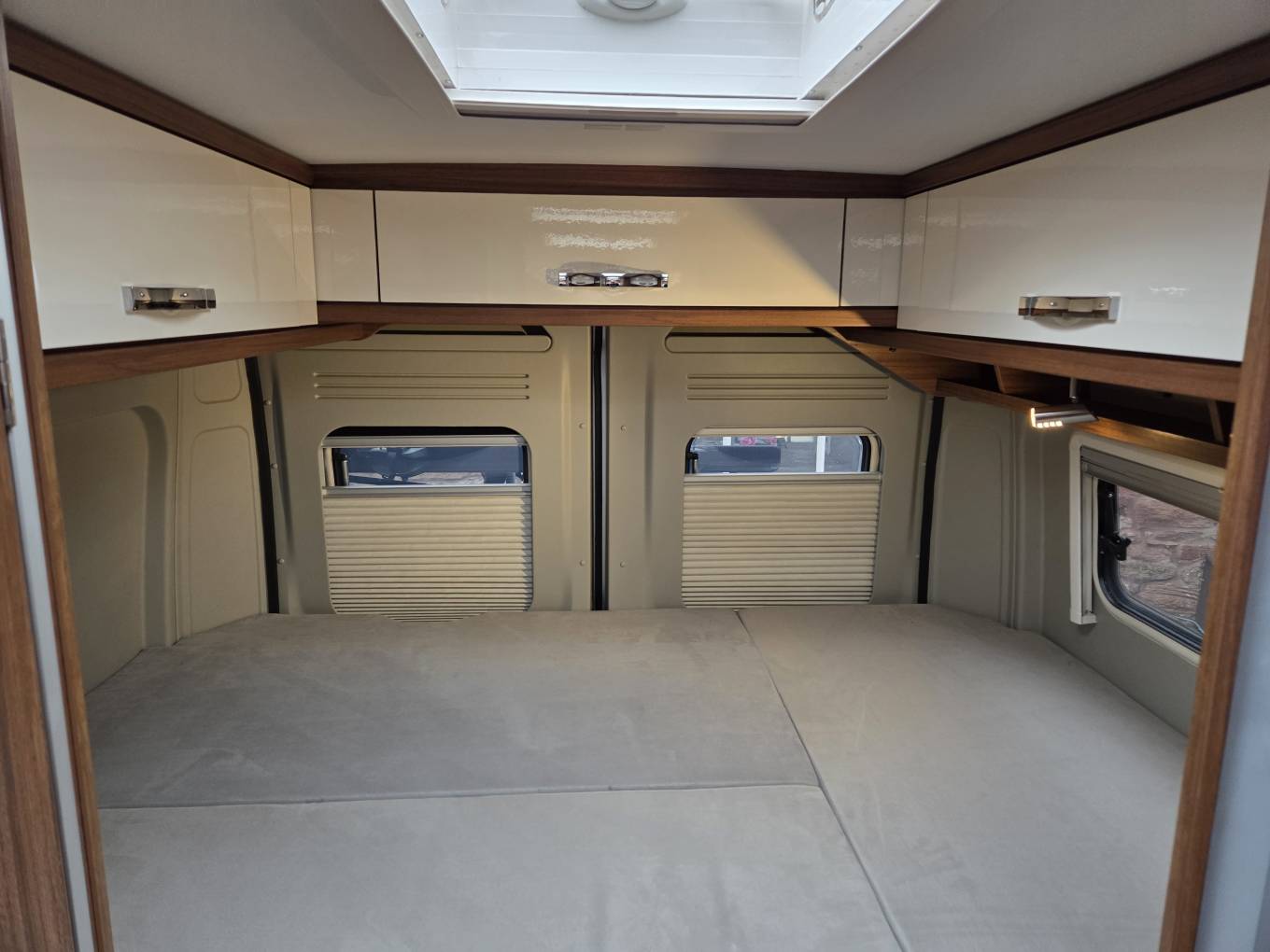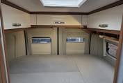 The gas bottle (2 x 11kg) compartment is accessed from the back of the van, via the barn doors. Above the bed, there are cupboards on both sides as well as at the back, which are deep enough to give quite a bit of storage room. There’s a tinted window on the nearside and this has shelving above it, adorned with several LED lights of both the spot and the movable variety.
