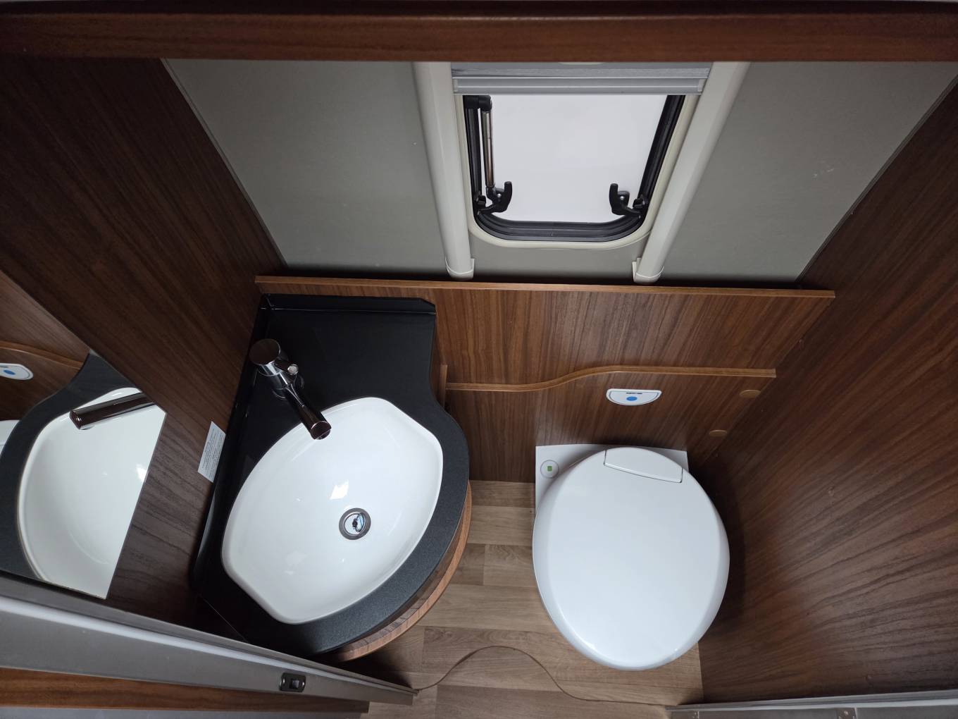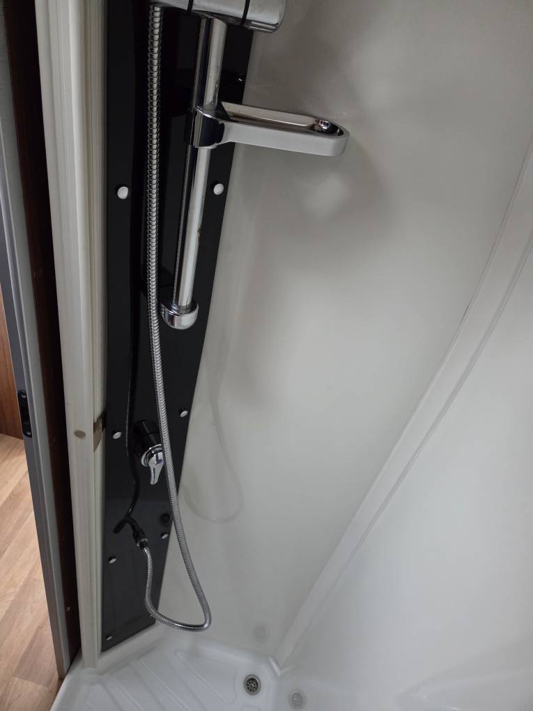 The van also has a separate washroom with swivelling Thetford flush cassette toilet and vanity sink on one side of the van and a sizeable shower room directly opposite. The wooden doors on both cubicles open independently in order to: