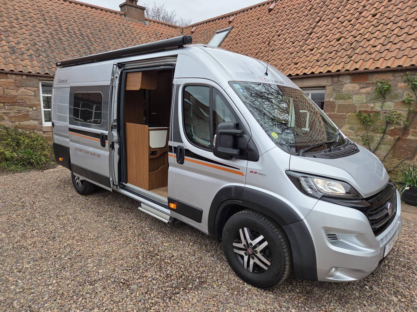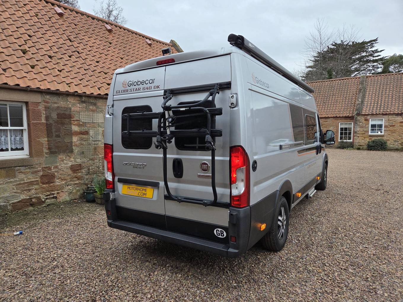 Externally the Globecar has a full length Fiamma wind-out canopy awning, electric hook up and twin bike rack.