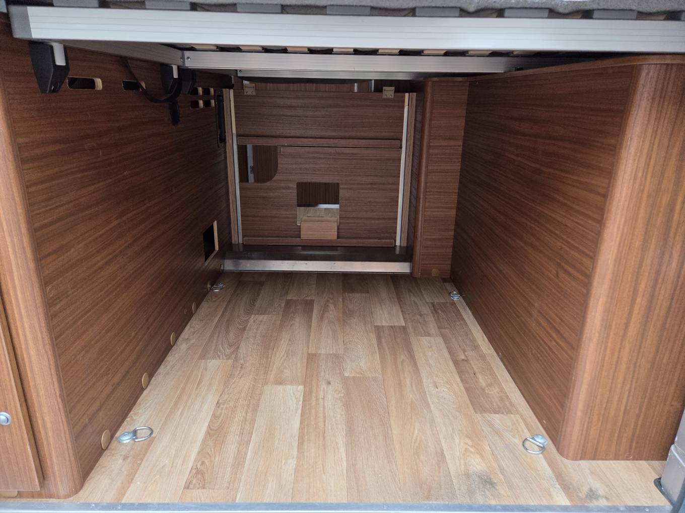 At the rear, the van has a XXL fixed transverse style double bed (6ft 5 x 5ft 4). With the middle section removed, either side can then be easily lifted in order to access all of the van's vitals that live under here. There’s a 100-litre fresh water tank that has two draining modes so you can leave 20 litres in reserve, in case you want to stop for a cuppa while on the road. There’s also a 92-litre waste water tank and Truma Combi 4 heating.