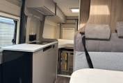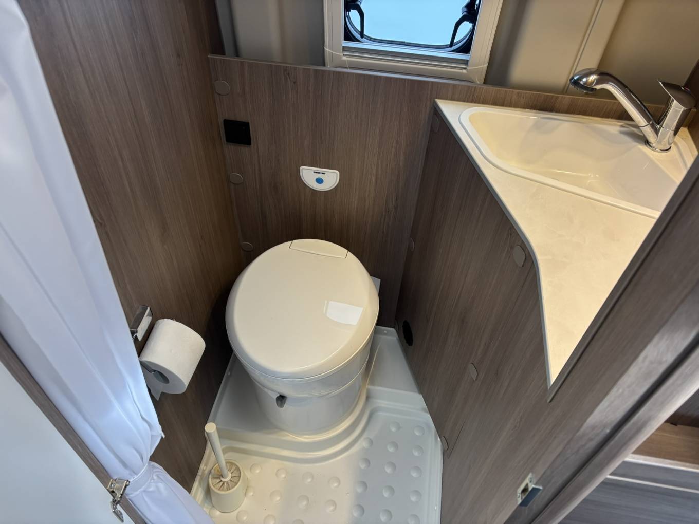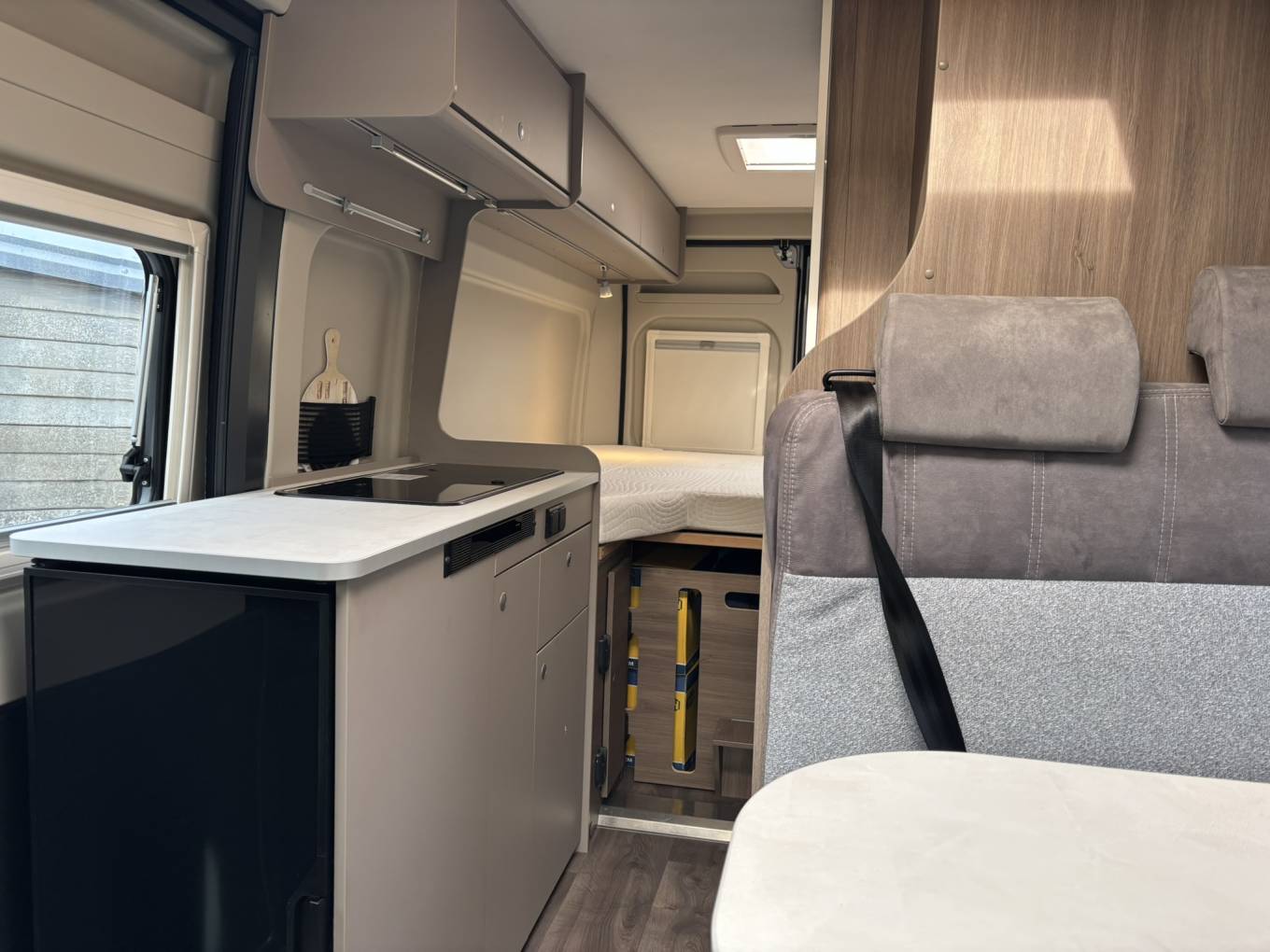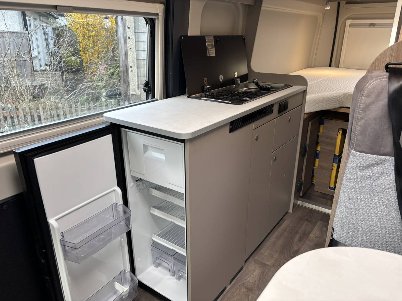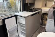The CV640 Pro features a well thought out interior layout that balances comfort and practicality. The front lounge area benefits from swivel cab seats and a fold-out table, creating a comfortable and sociable space for relaxing or dining. The central kitchen is compact yet functional, equipped with a two-burner hob, sink with mixer tap, and useful storage throughout. The washroom is located at the middle of the vehicle and comes equipped with a cassette toilet, sink and mixer tap, vanity mirror.