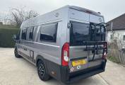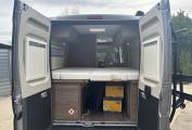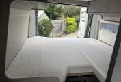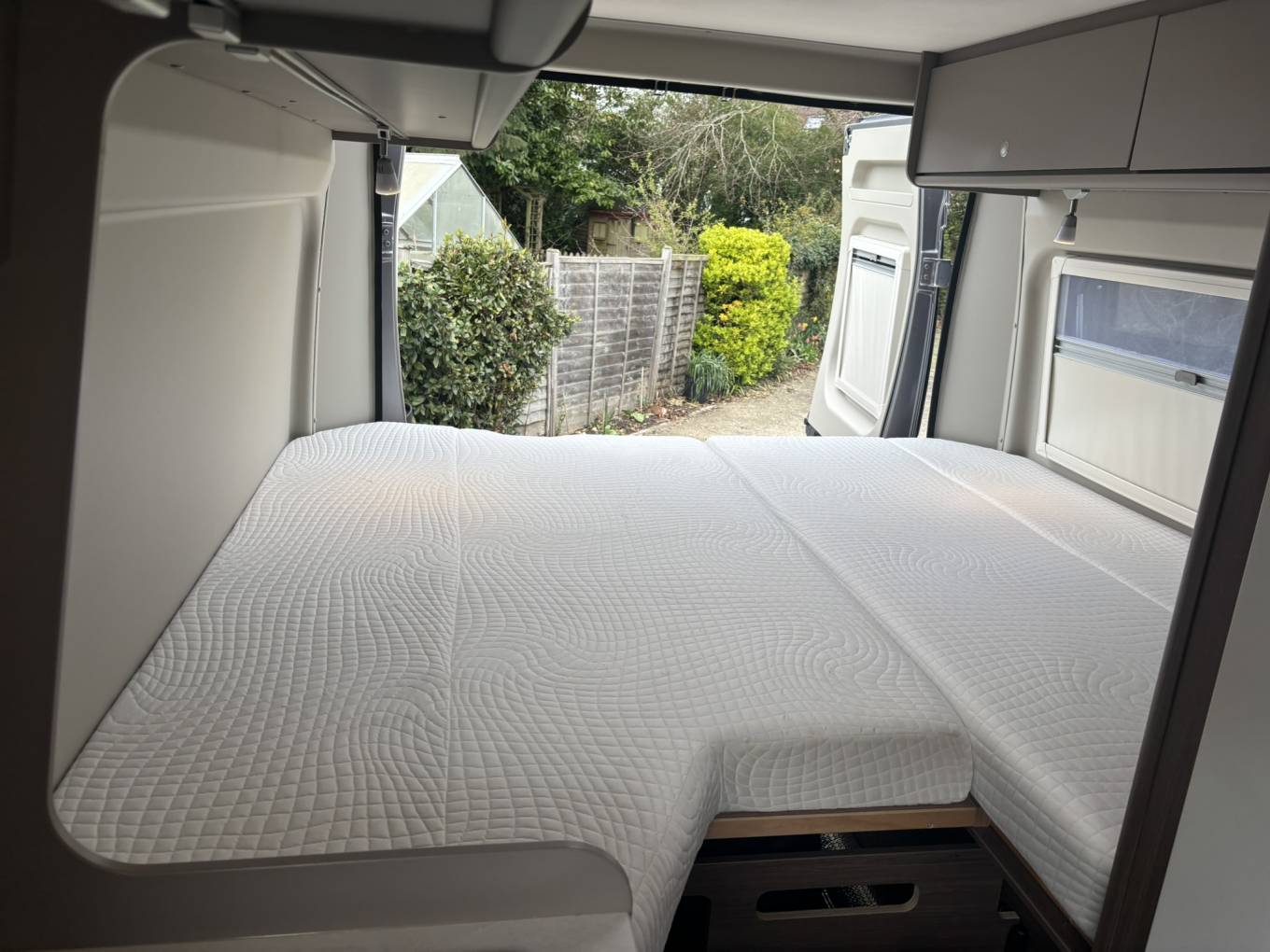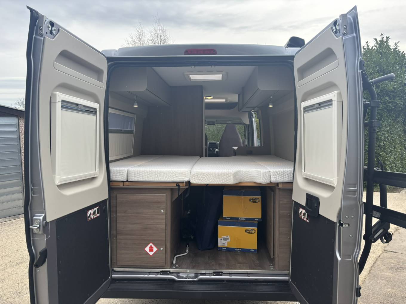 To the rear, the van offers a spacious double bed with a large garage storage space beneath, ideal for additional touring equipment. The upgraded off-grid setup, including lithium battery, inverter, and solar panel, makes this an excellent choice for those looking to travel independently without reliance on campsite hook-ups.