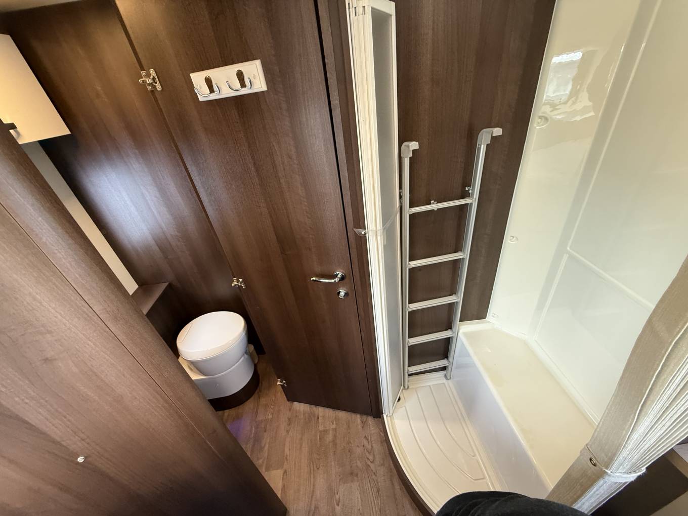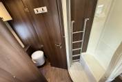 The layout is from the rear you have a full sized bedroom with centre island bed with plentiful storage above and below the island bed. This bedroom sits above the full sized garage which can be accessible from both sides and can accommodate leisure and sporting equipment and holiday provisions. You then have the two sided toilet with on the nearside having a toilet and sink and then the separate full shower cubicle on the offside, the shower has full circular enclosure and the toilet has a door which can be used for privacy from the rest of the motorhome. The kitchen covers both sides of the motorhome with oven grill and 3 gas burner hob and sink on one side and on the other side you have a full sized tall fridge with freezer with storage around plentiful. The modern and light front dinette/lounge has 3 travelling seat belts and a seat to the habitation door with up market upholstery all in cream leather and it has the 2 front cab seats able to swivel to accompany extra people when dining. The electric drop down bed can be accessed using the seats or for greater height the ladder and the dinette table can lower to make a children’s sized bed.