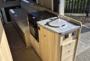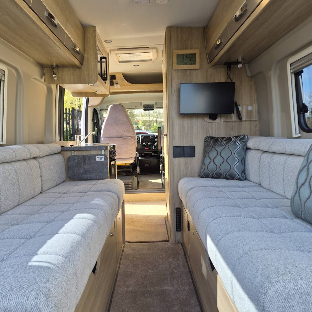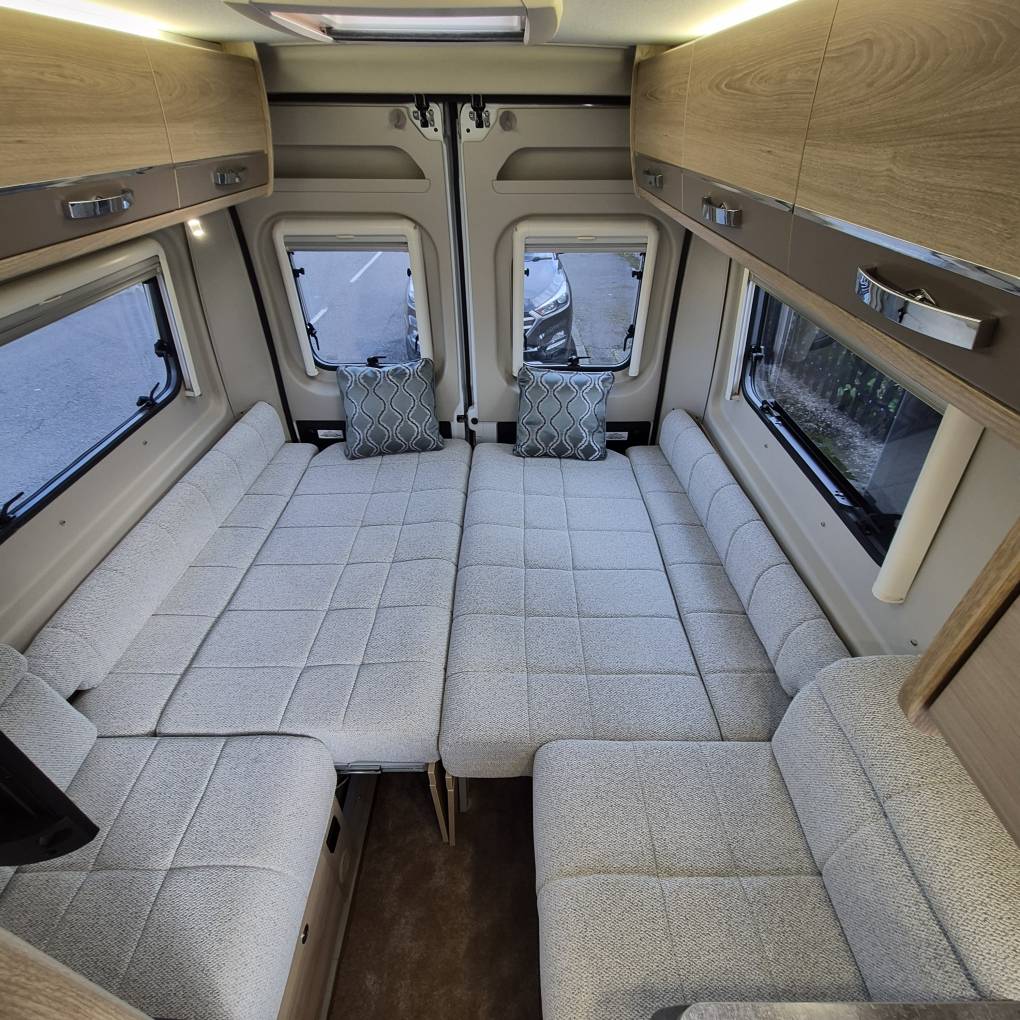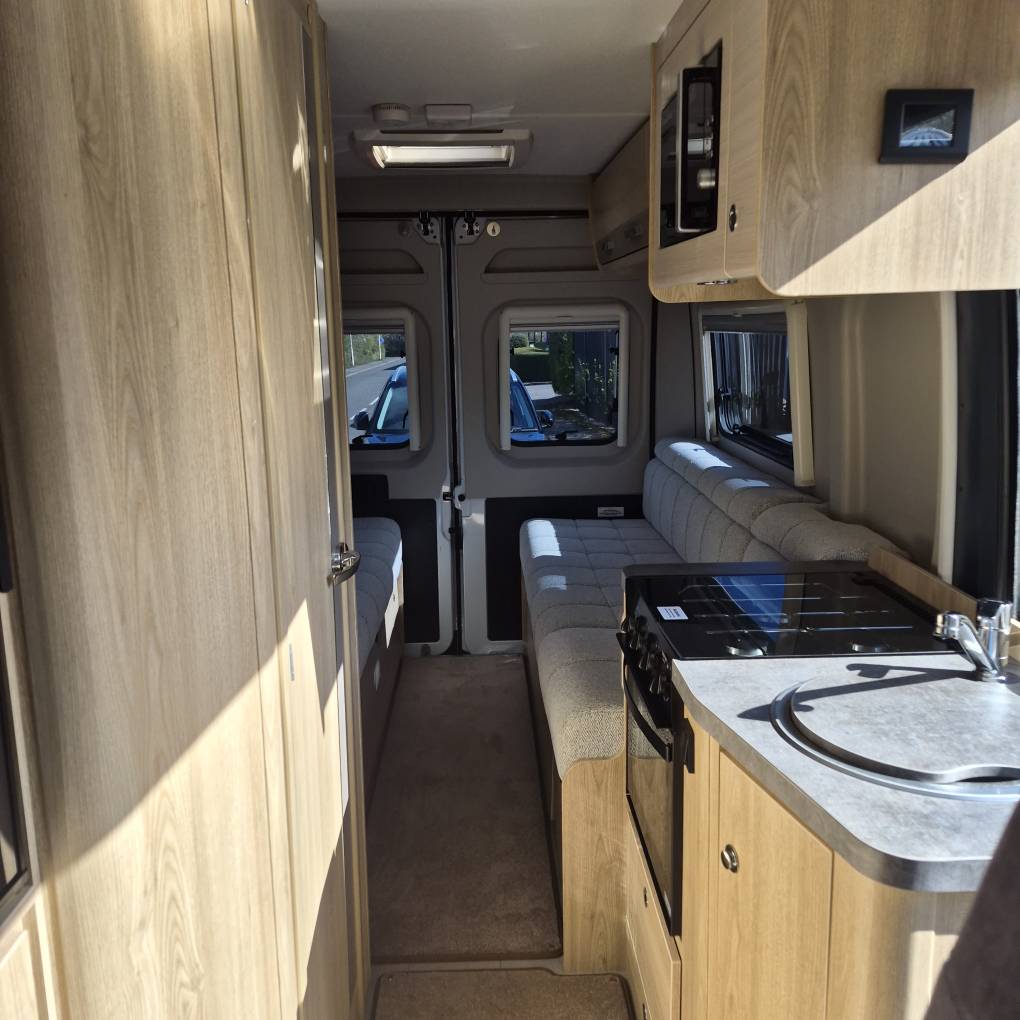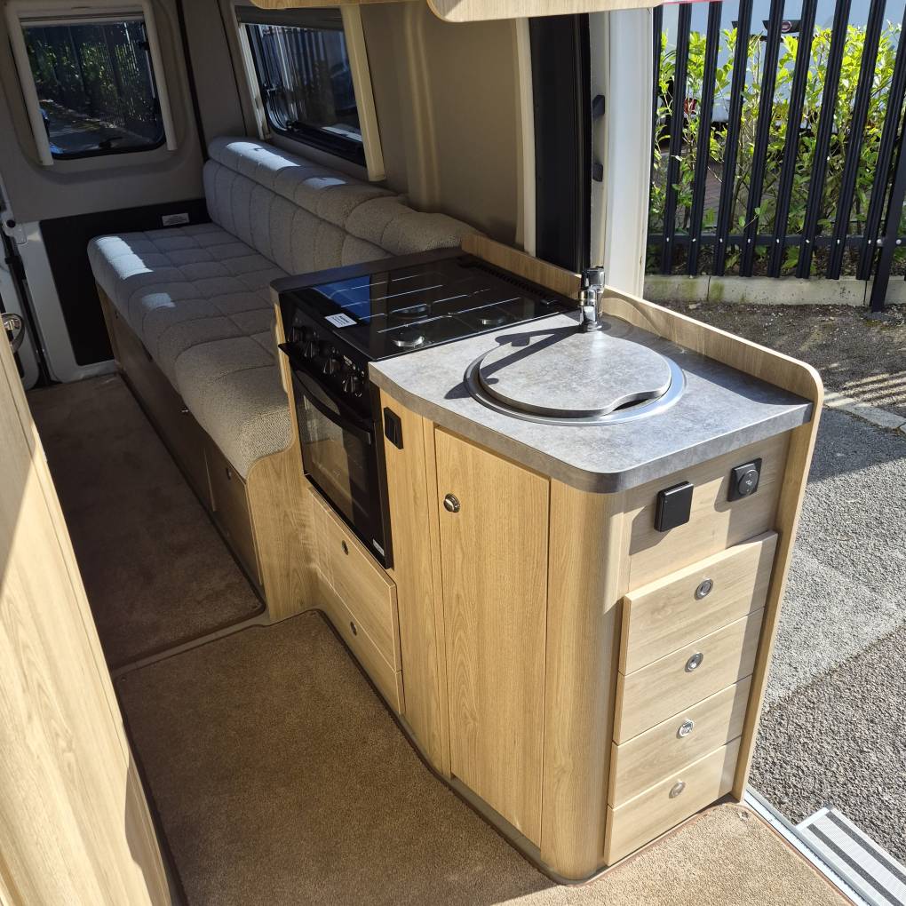 In this 2020 model features include a rear lounge that converts into either twin single beds or a double, a fully equipped kitchen including a sink with hot and cold water, gas hob, oven and grill, fridge-freezer and microwave. A central wet room provides a shower, toilet and basin.