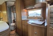 The layout is from the front you have a good sized light and airy lounge area with a large dining table and a long side bench seat, the cab seats both swivel to give extra seating options when relaxing or dining and there is plenty of head height storage lockers in and around this area. Moving back you have a well-equipped kitchen which features an oven, grill, gas hob with 3 burners, microwave, sink with mixer tap and large fridge with separate freezer (fridge works on 240v Electric and 12v Battery) and there are also lots of cupboards and storage space for all you cooking utensils and ingredients.