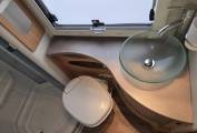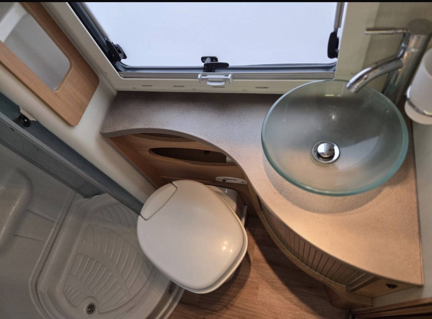 At the rear of the motorhome is the extremely comfortable fixed French bed that has an electronic height adjustable setting and manual foot adjustable setting for extra comfort and a good nights rest and sleep with loads of storage space underneath, at the side rear of the motorhome is a good sized washroom which includes a Thetford flush cassette toilet, vanity sink and separate shower.