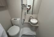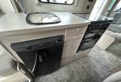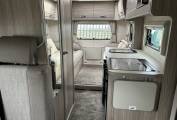 The kitchen is well equipped for family touring, featuring a Thetford oven and grill, microwave, 3-burner gas hob with 1 electric ring, and a large Dometic fridge/freezer. The washroom includes a Thetford toilet and practical facilities, while heating and hot water ensure year-round comfort.