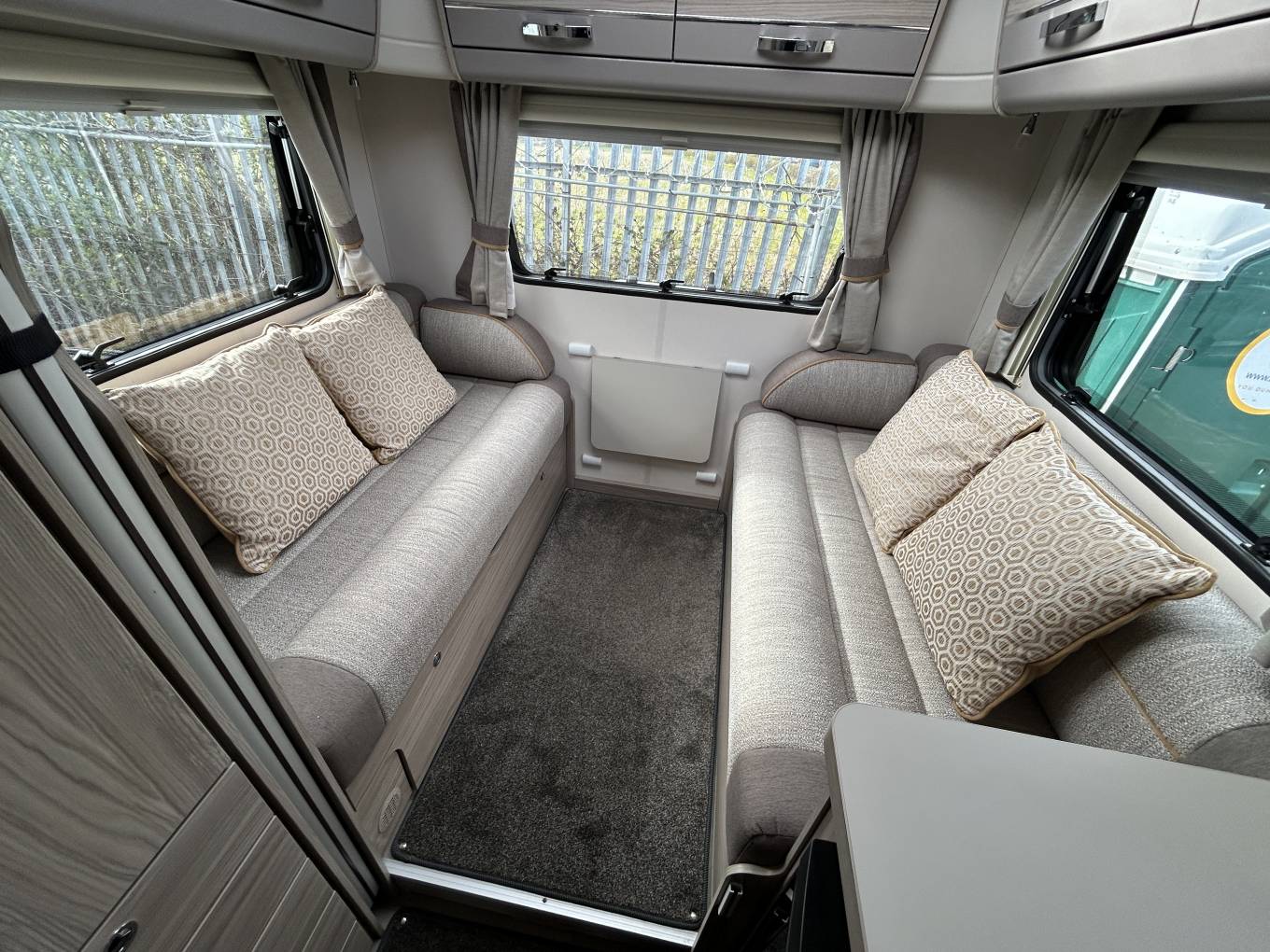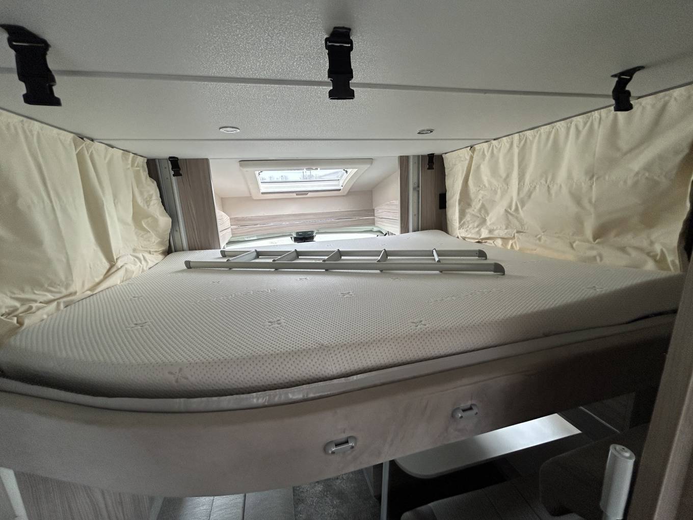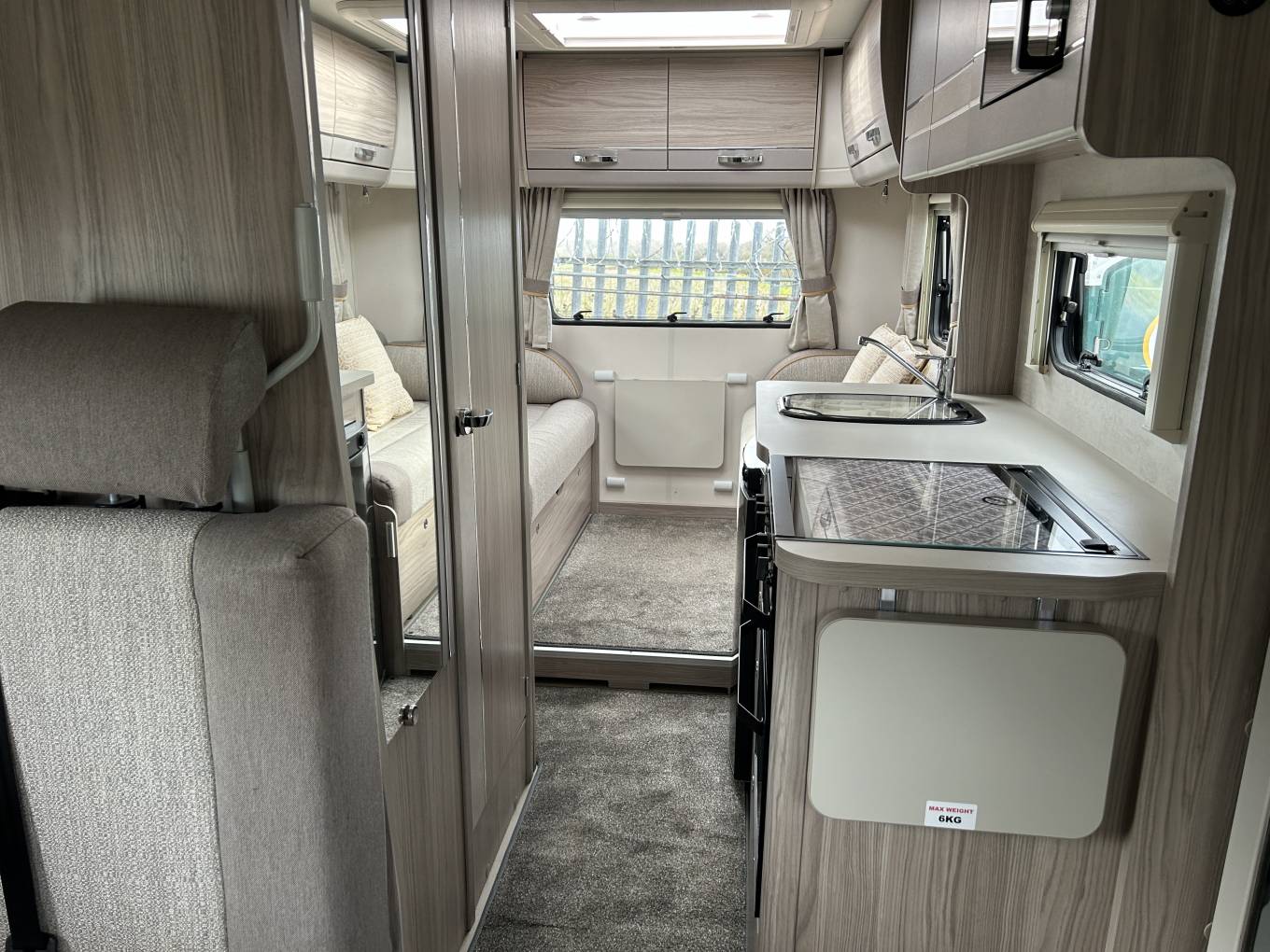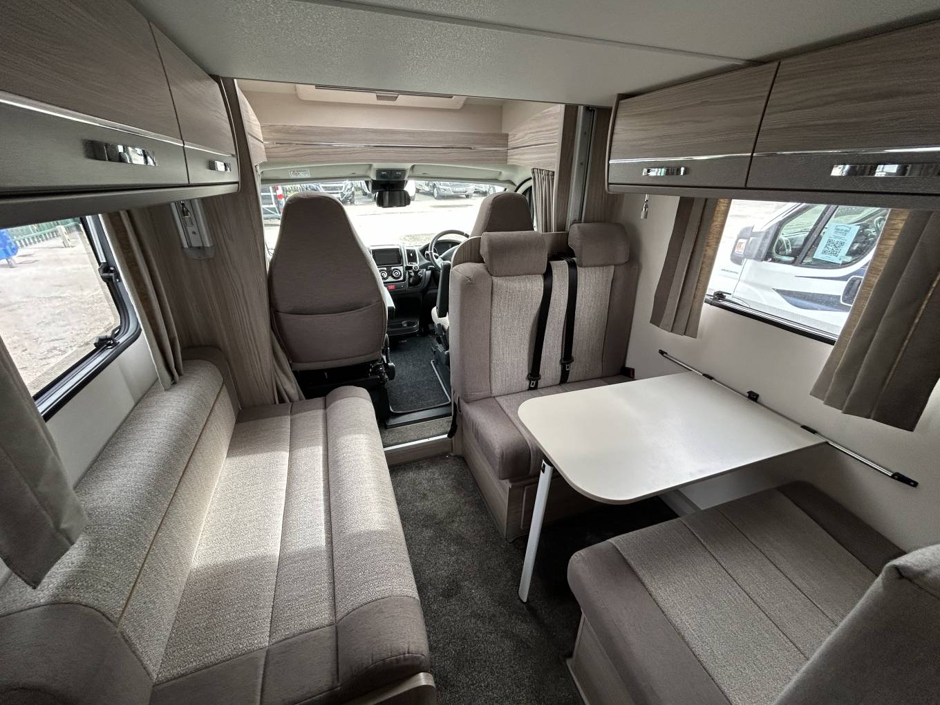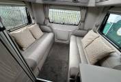 Inside, the layout is designed with both comfort and practicality in mind. The centre dinette converts into a double bed, while the end lounge with opposing bench seats transforms into an additional double, creating a bright and sociable living area by day. There is also a convenient electric drop-down bed, allowing for true 6-berth capability without compromising space. Features such as removable carpets, USB points throughout, swivel cab seats, and an additional fold-out dining table enhance everyday usability.