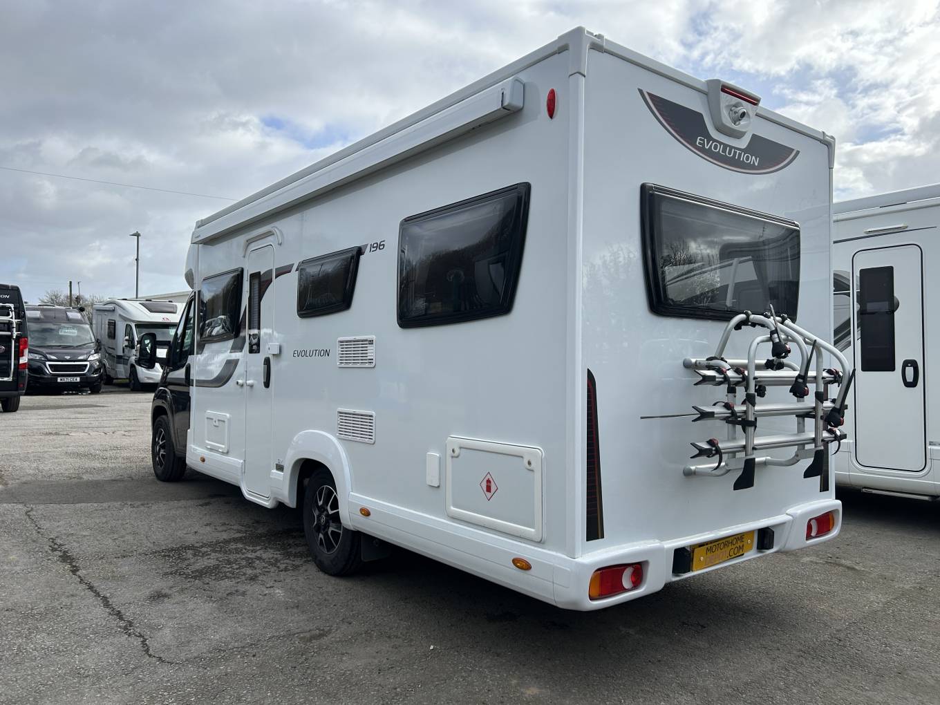 Externally and mechanically, this Evolution 196 is fully prepared for touring with a wind-out canopy, solar panel, reversing camera, bike rack, aerial, tracker, Whale BBQ point, and two keys. Additional features such as cab air conditioning, multifunction steering wheel, radio, TV bracket in the lounge, and rear travel belts complete a very strong specification.