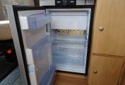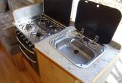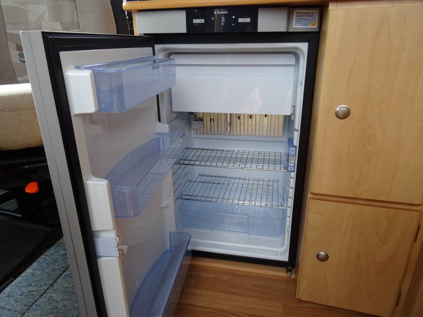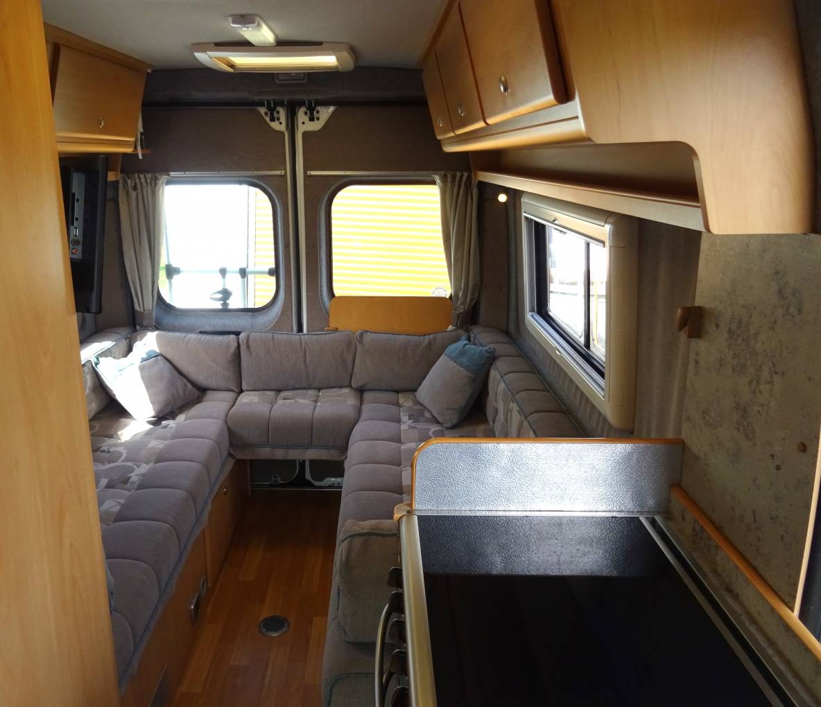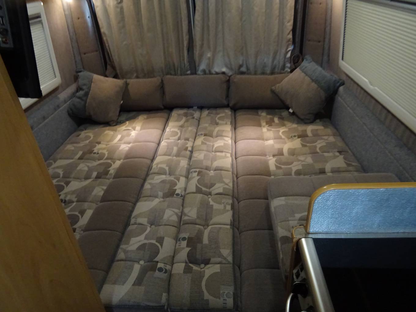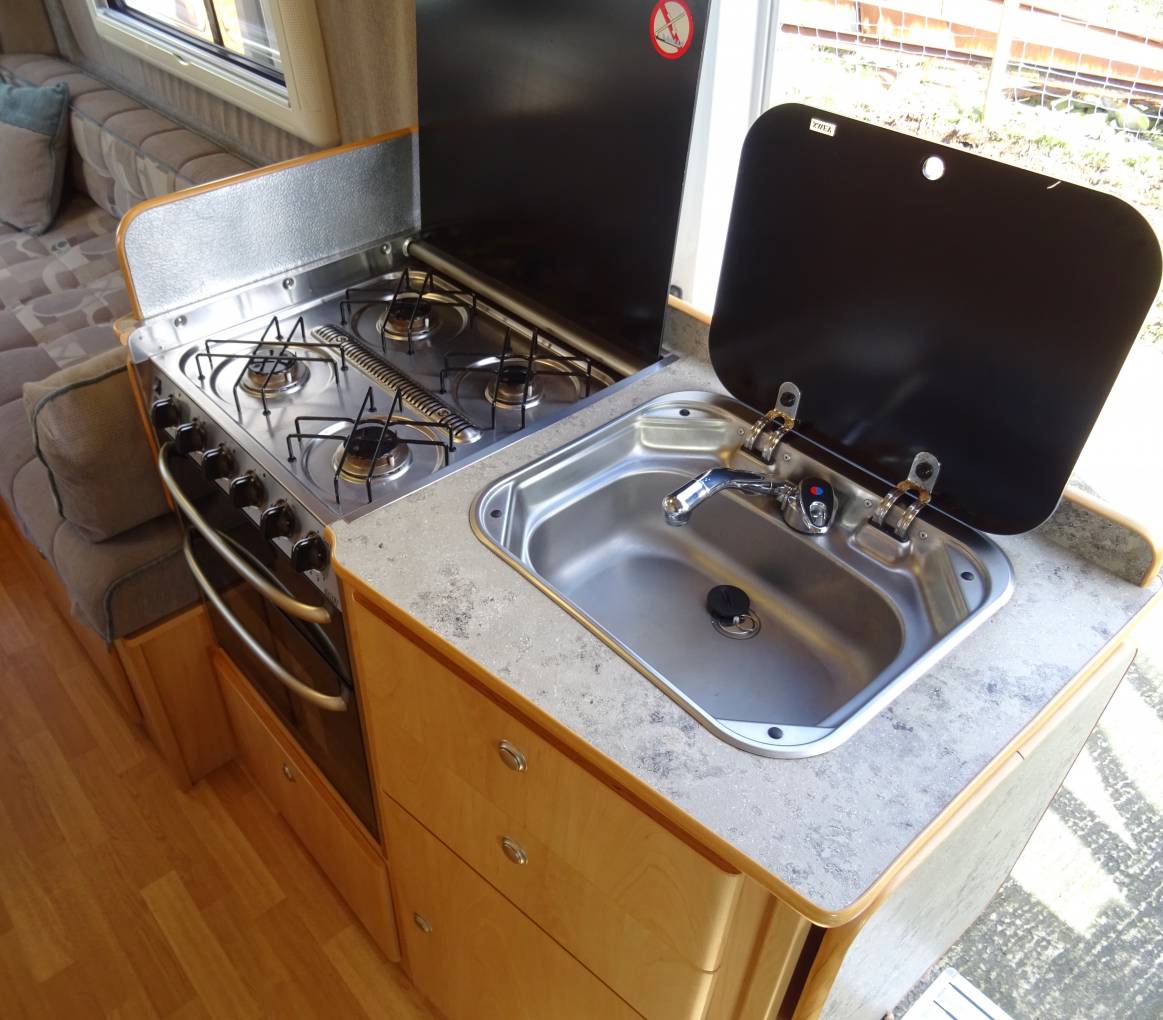 At the rear is the all-important lounge with rear opening doors and comfortable bench sofas that face each other, ideal for socialising, relaxing or dining, with a removable table. The upholstery is in excellent condition throughout and there is upper locker storage. The seating simply meets in the middle with supports, the back rests drop in as infill cushions and the double bed is up and ready with storage beneath. Blinds with flyscreens are supplied for the windows, with curtains for the rear windows. Moving forward passed the wardrobe space is a well-proportioned kitchen, which includes a stainless steel sink with mixer tap, a Smev hob includes four gas burners, with grill and oven below, a Dometic three way combination fridge freezer, worktop extensions and plenty of cupboard and locker space.