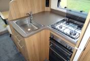 Moving to the middle the L shaped kitchen area has all you need and is a good size and comes equipped with a 4 ring gas hob, oven and grill, large fridge with separate freezer, sink/worktop area with ample storage cupboards and drawers.