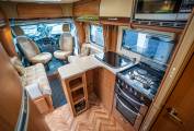 Kitchen | Complete with a fully equipped bespoke kitchen, featuring a Thetford Duplex Oven & Grill, Full Sized Thetford 175L Fridge/Freezer, Built in Microwave, and plenty of Worktop space. All enveloped by the standout feature of a retractable island breakfast bar makes this vehicle truly one of a kind.