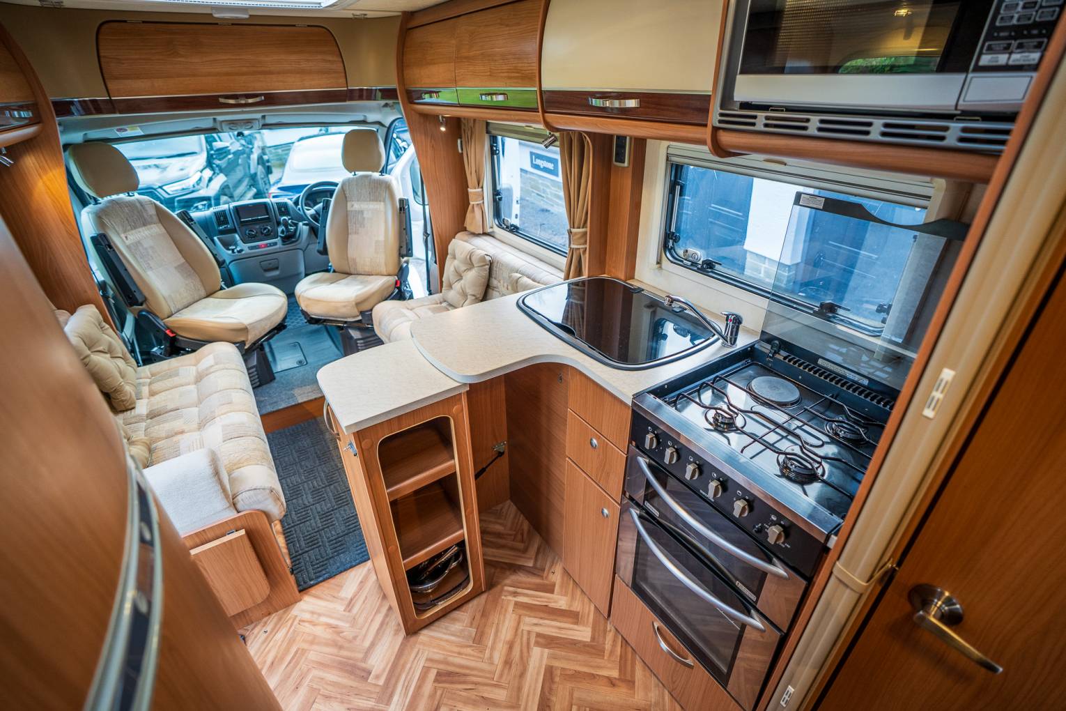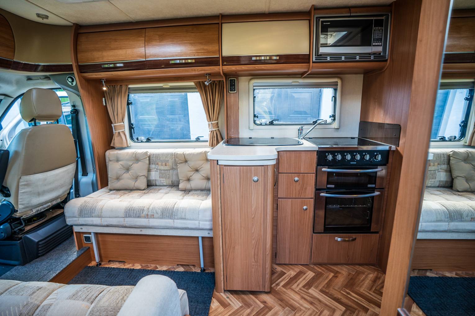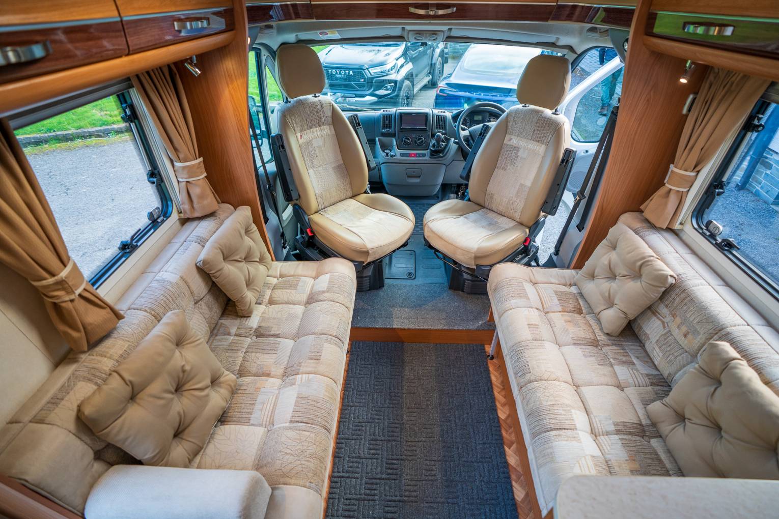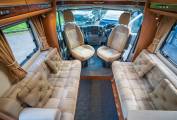 Interior | The interior is styled with classic Oak effect cabinets with contrasting cream furniture and patterned upholstery. The impressive windows and and skylights open up this motorhome to create a welcoming and homely environment