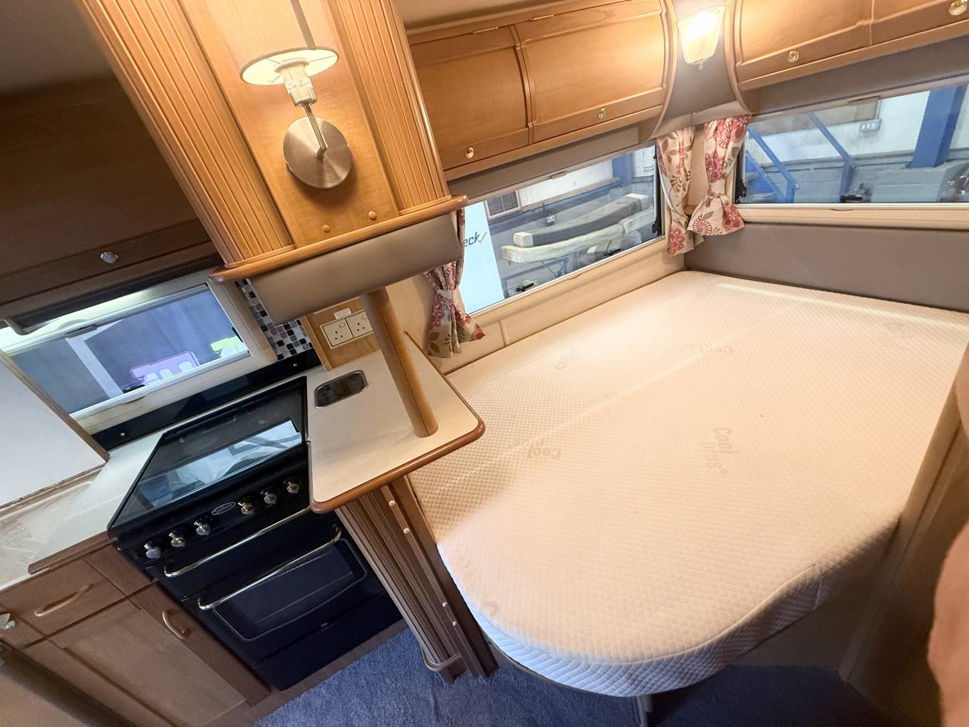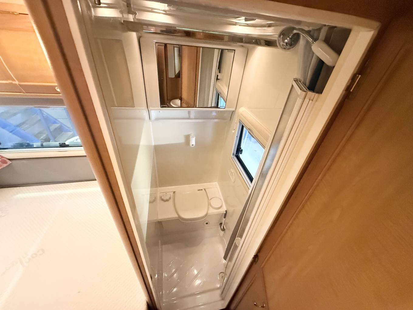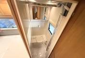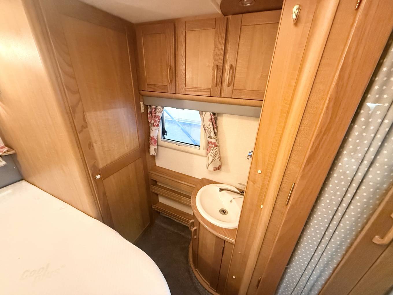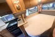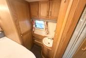 a fixed French bed which can be lifted to access the under bed storage, to the side of the bed consist of a Thetford fresh water flush casette toilette, to the front is the shower whith perspex doors to close. The sink a white enamel style hand basin with chrome mixer tap is situated in a dressing area just to the front of the bathroom.