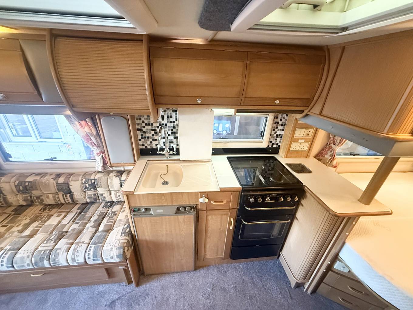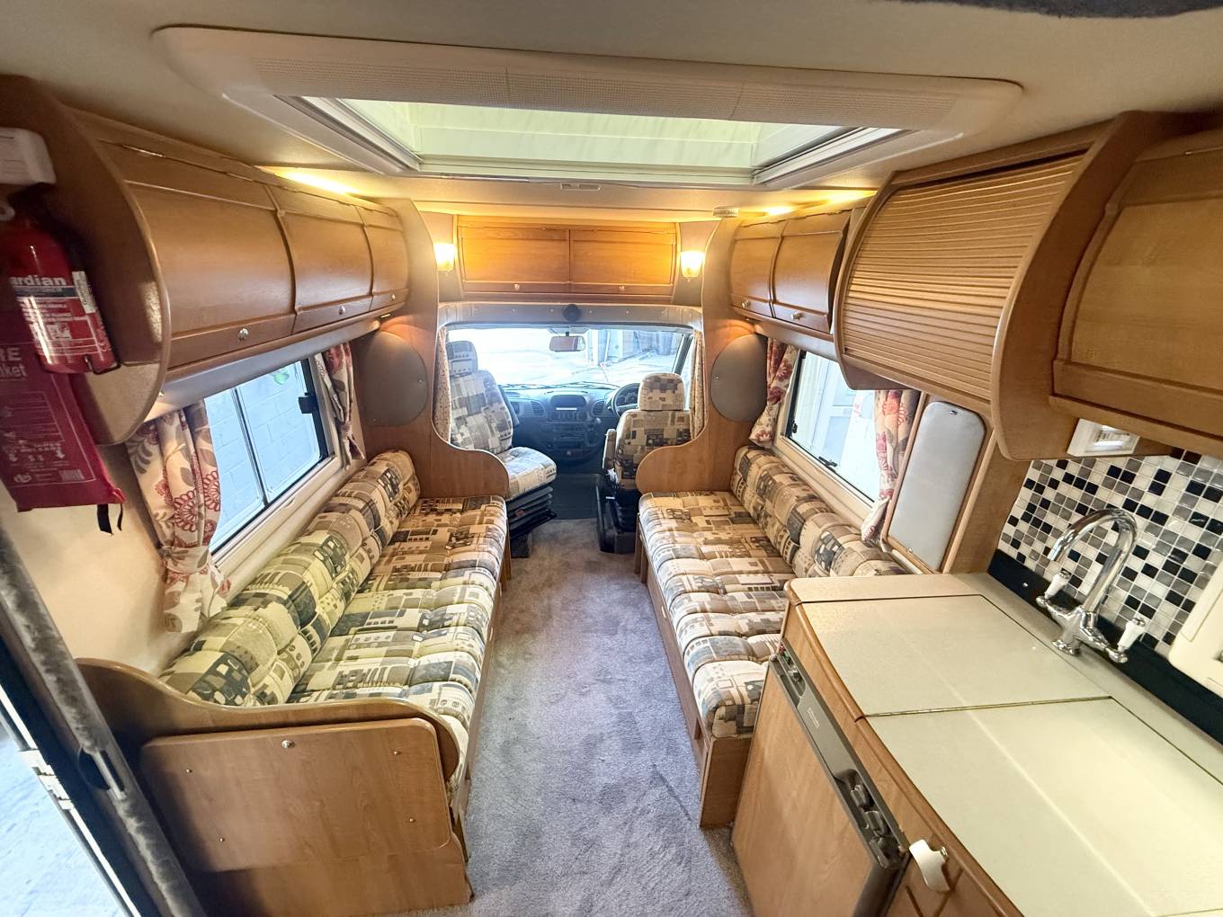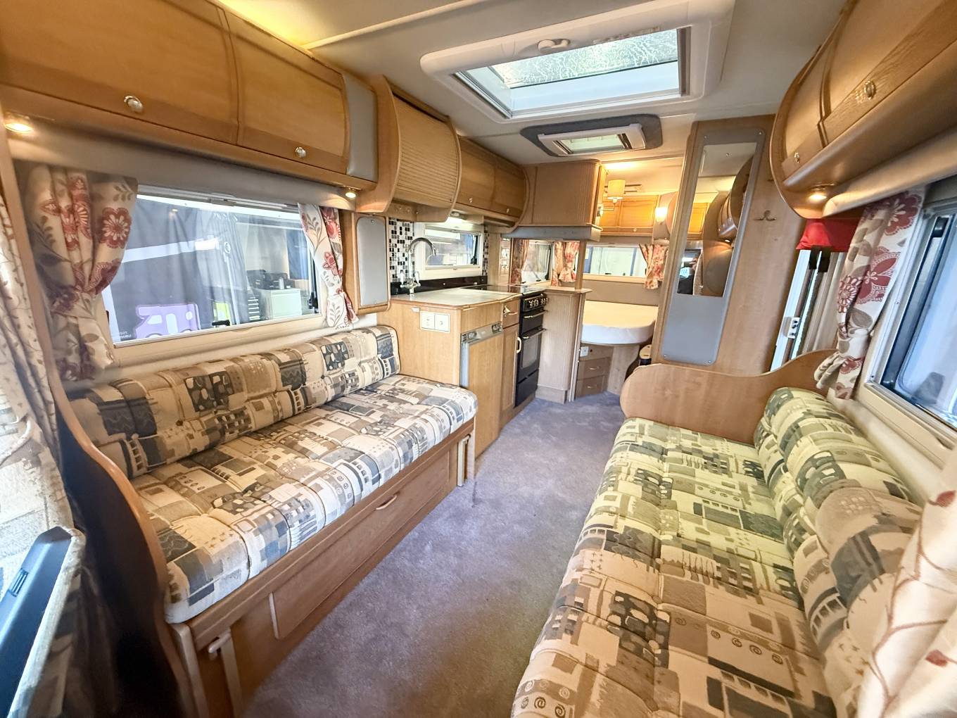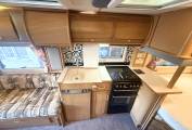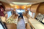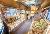 We enter the motorhome on the near side via an electric step immediately to the left is the front lounge area which consists of twin opposing sofas, there is a small side table for occasional use or a large free standing table that stows away while not in use. The front seats also rotate to join this area so you could easily sit 6 people around the table when entertaining on site. The sofas will pull together at night to form an additional double bed.