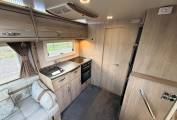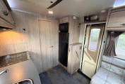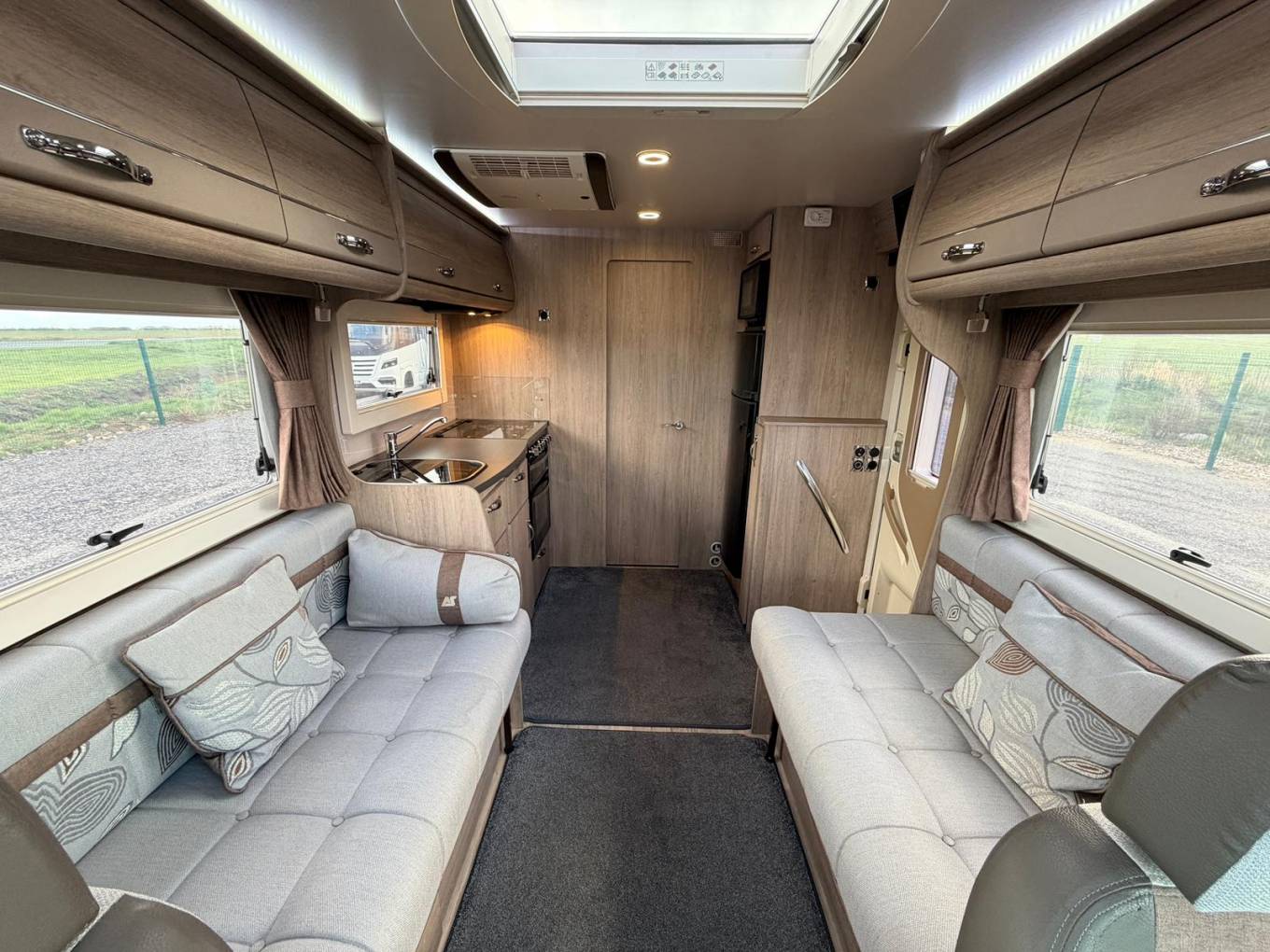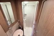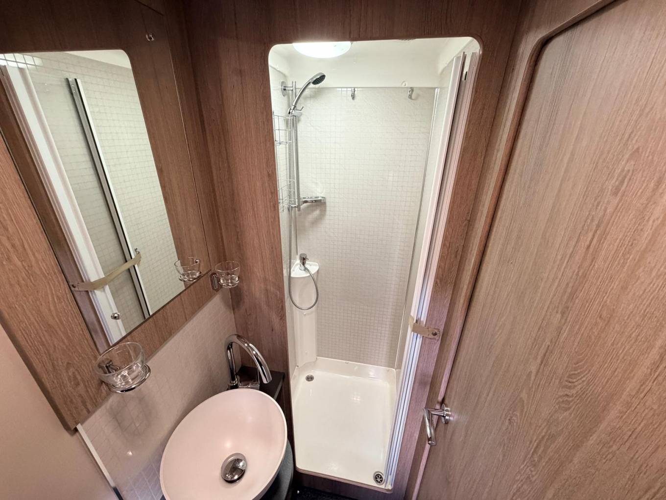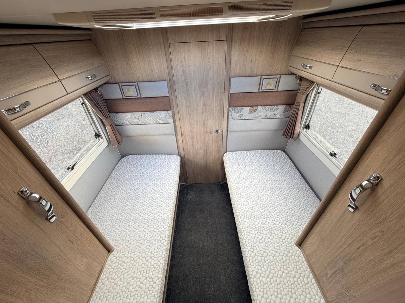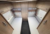 The layout is designed for comfort and practicality. At the rear are twin fixed single beds, providing easy access and a flexible sleeping arrangement and generous under storage. Moving forward, the full-width rear washroom offers a separate shower cubicle, electric flush cassette toilet and vanity sink, creating a spacious and usable bathroom area. The front lounge features parallel settees and swivel cab seats, forming a bright and sociable living space that converts into an additional double bed when required.