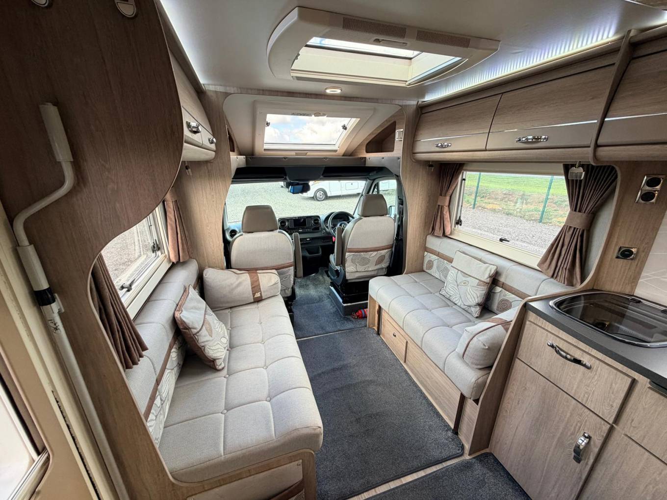 The interior presents with a modern, high-quality finish throughout as typical of Auto-Sleepers, with well-crafted cabinetry, soft furnishings and good natural light from multiple windows and rooflights.