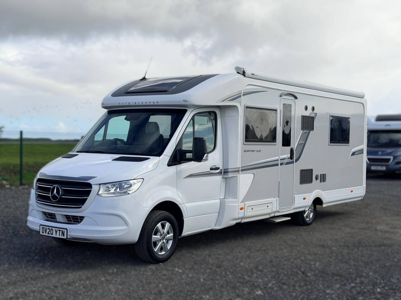 Located in Hull, at Maple Lesuire Garage, this 2020 Auto-Sleepers Burford Duo is a high specification 4 berth, 2 seatbelt luxury motorhome built on the Mercedes-Benz Sprinter chassis with the 2.2L CDI engine producing approximately 163bhp and 7-speed automatic gearbox. With 38,000 miles from new and only 1 owner, it represents a sought-after example of this premium model at a bargain price!