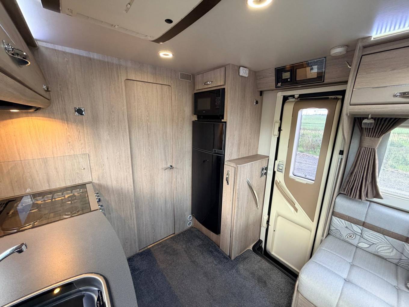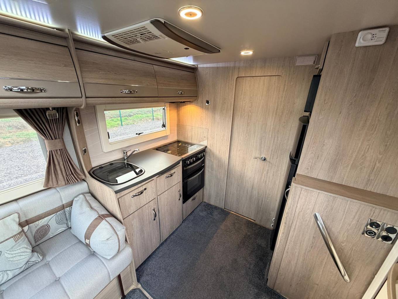 The central kitchen is well equipped for extended touring, featuring a dual fuel hob with three gas burners and one electric hotplate, separate oven and grill, microwave, extractor fan and a large fridge freezer, along with ample storage and workspace.