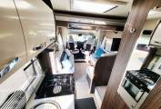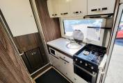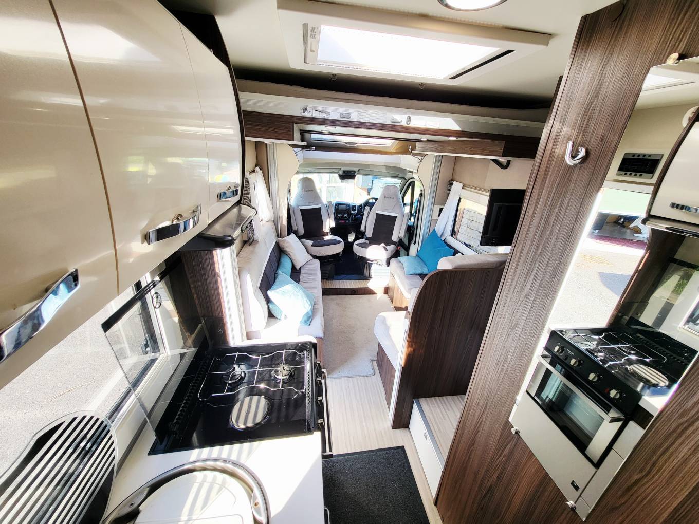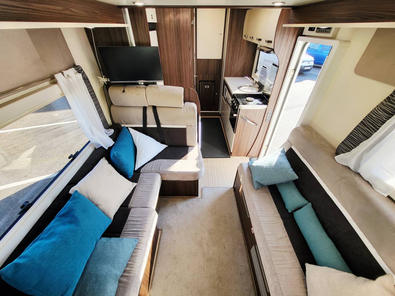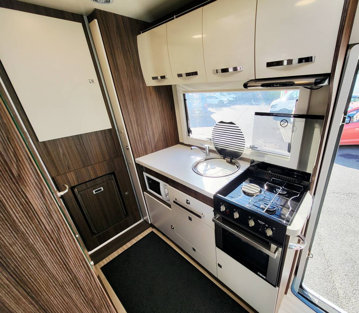 There is a central washroom with a Separate shower room, cassette toilet and wash basin plus a very large Storage cupboard /Wardrobe. A central kitchen which features a dual fuel hob, 2 gas burners and 1 electric burner hob, gas oven & grill Stainless steel sink, extractor fan and Microwave oven and large worksurface area. Large tall fridge with Freezer compartment and an additional large slide out cool box underneath.