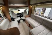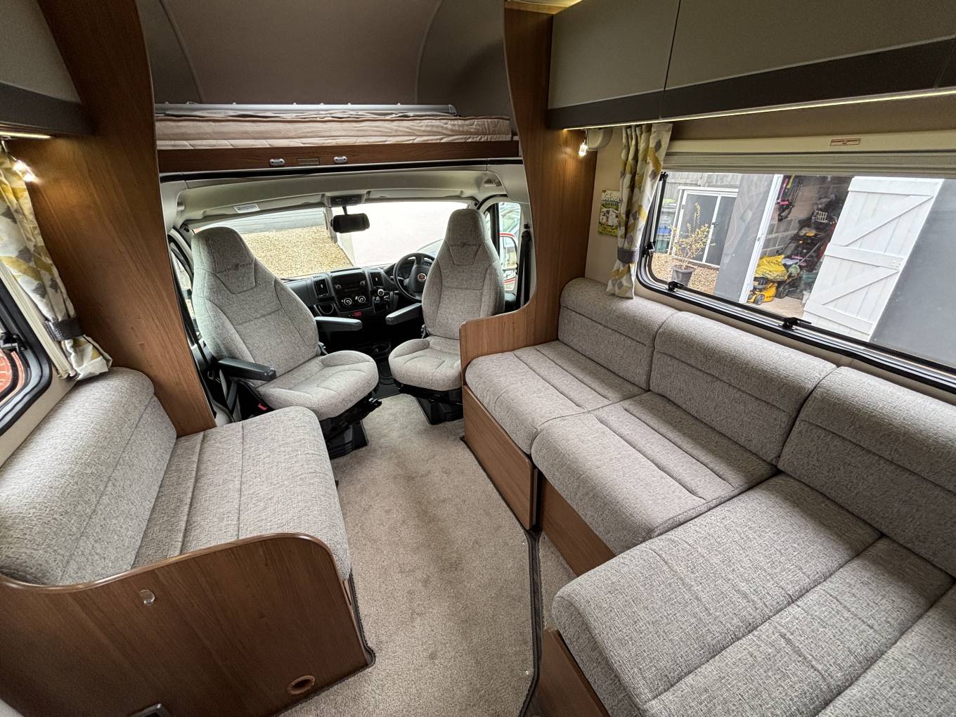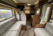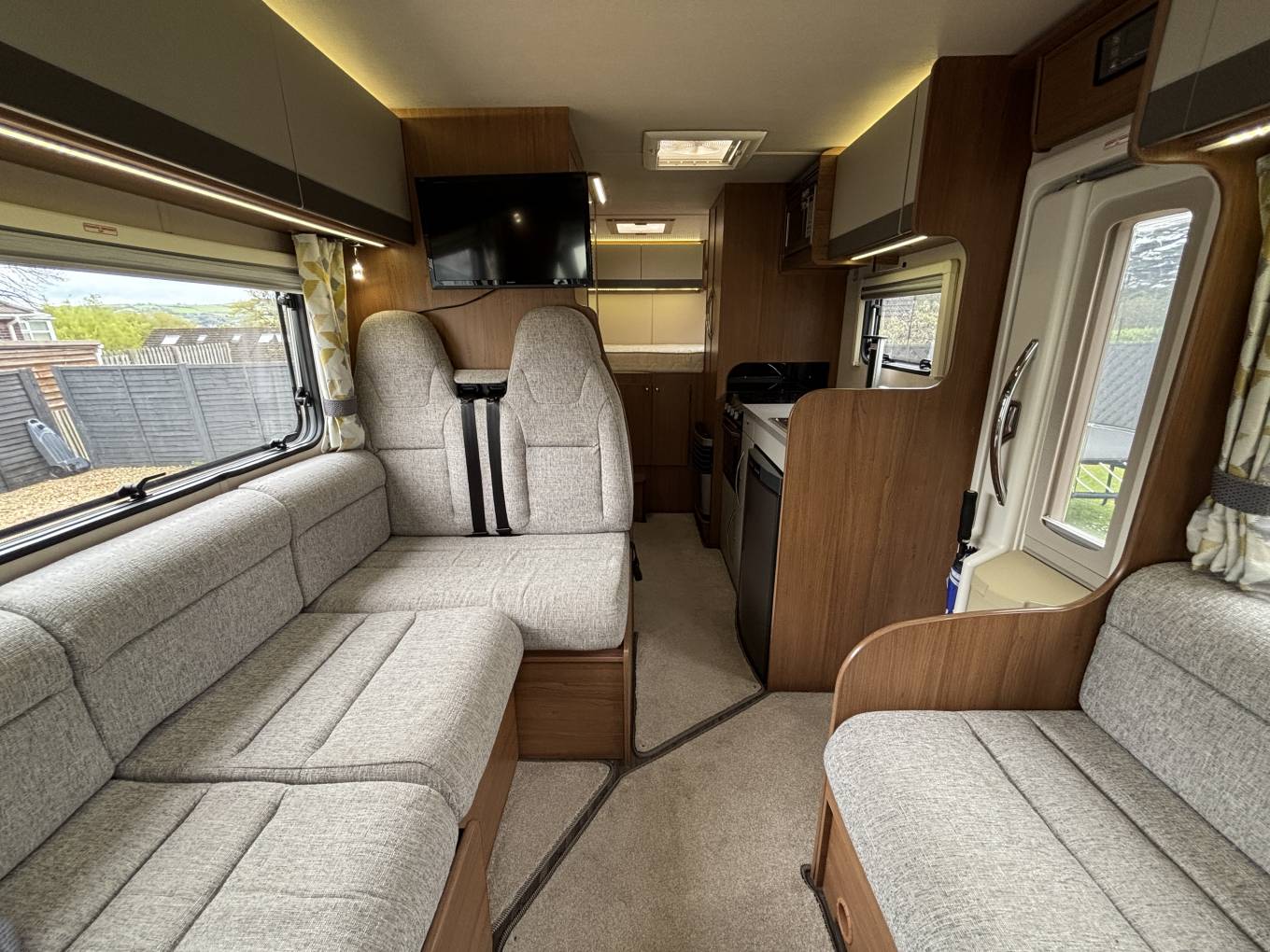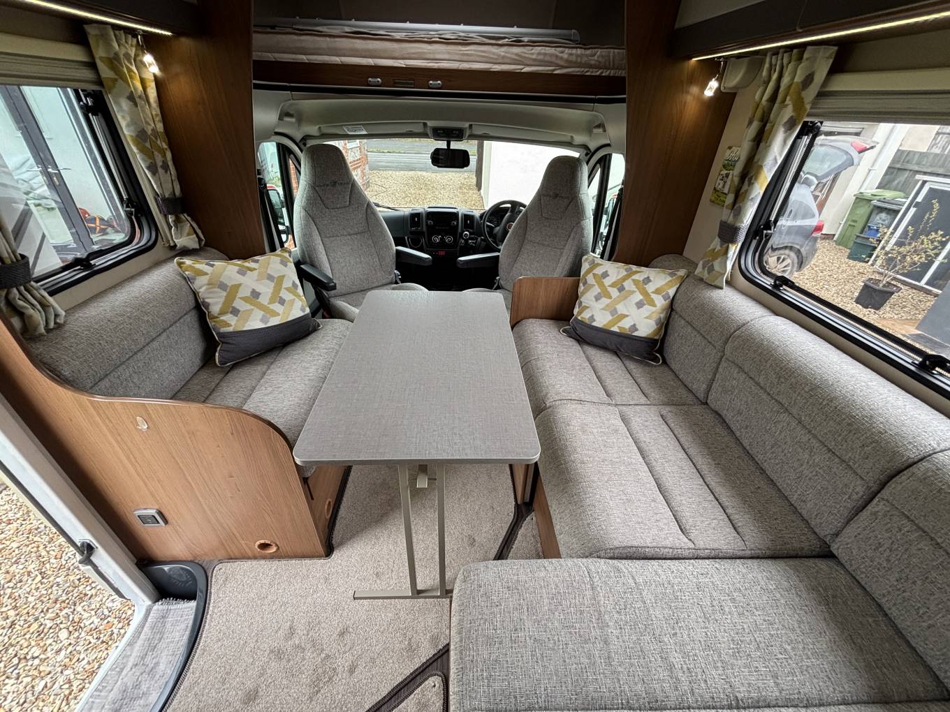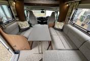 When you step inside the motorhome by the habitation door on the passenger side, you are greeted with an L shape and side facing sofa to create a good size relaxation and dining area with lovingly looked after fabric upholstery and good all round storage. There is a freestanding table for dining and the sofas convert to a single bed.