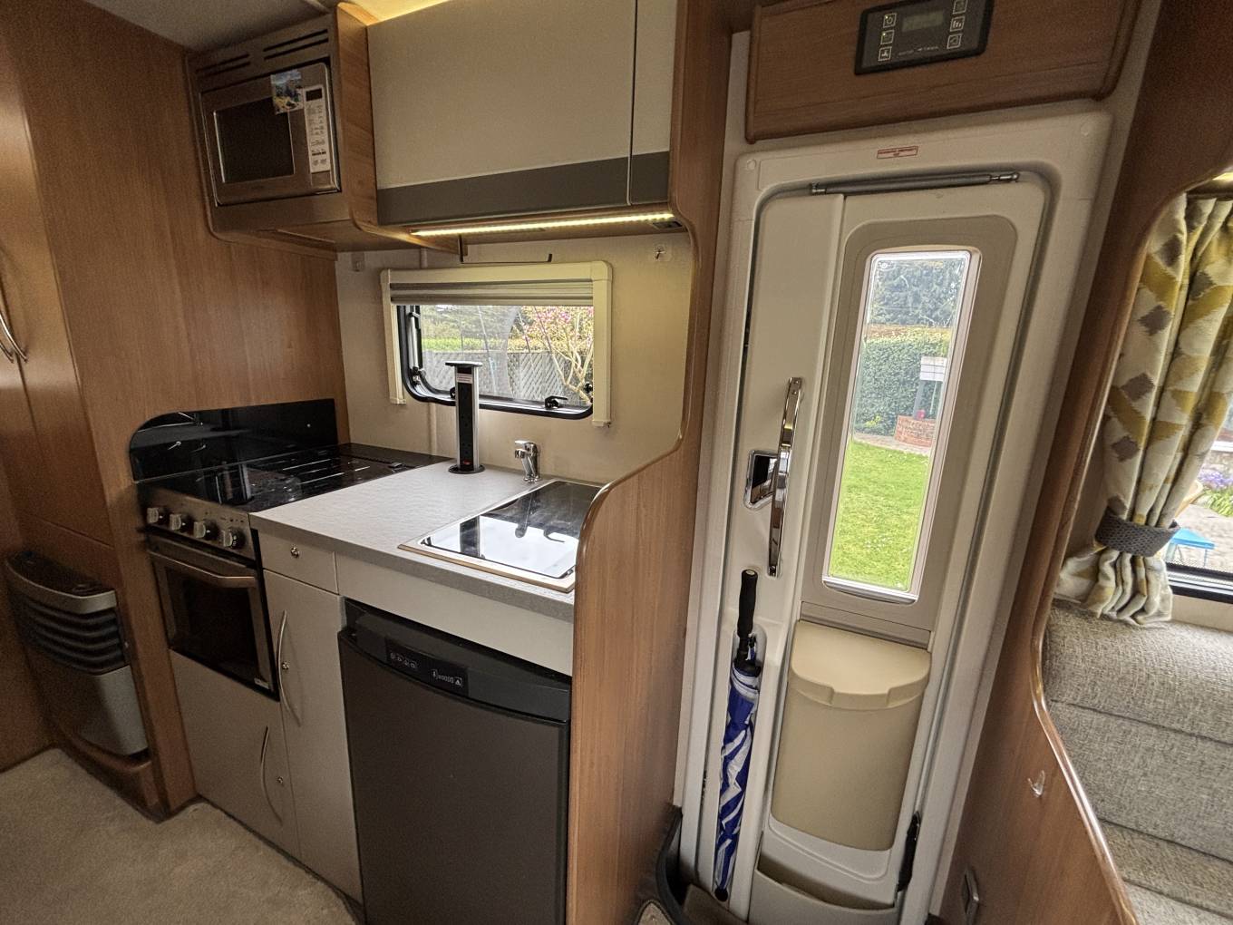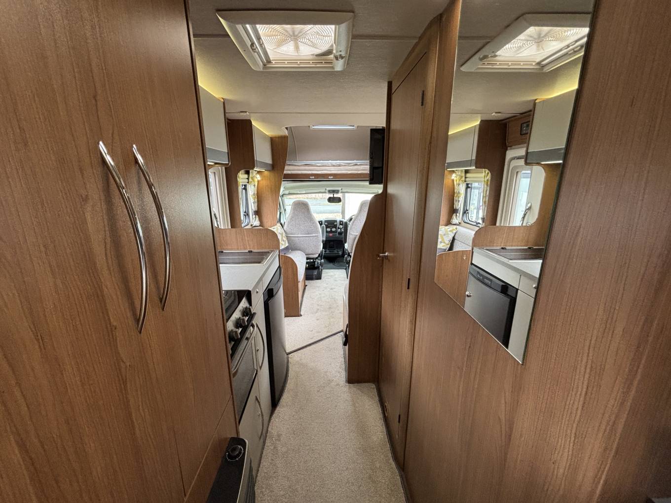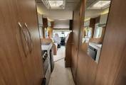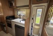 Moving through to the center of the motorhome is the well equipped kitchen area, fitted with fridge and freezer box, 3 burner gas hob, gas oven and grill, sink with mixer tap and plenty of storage. This area also features an electric roof vent fan for both extraction and fresh‑air intake.