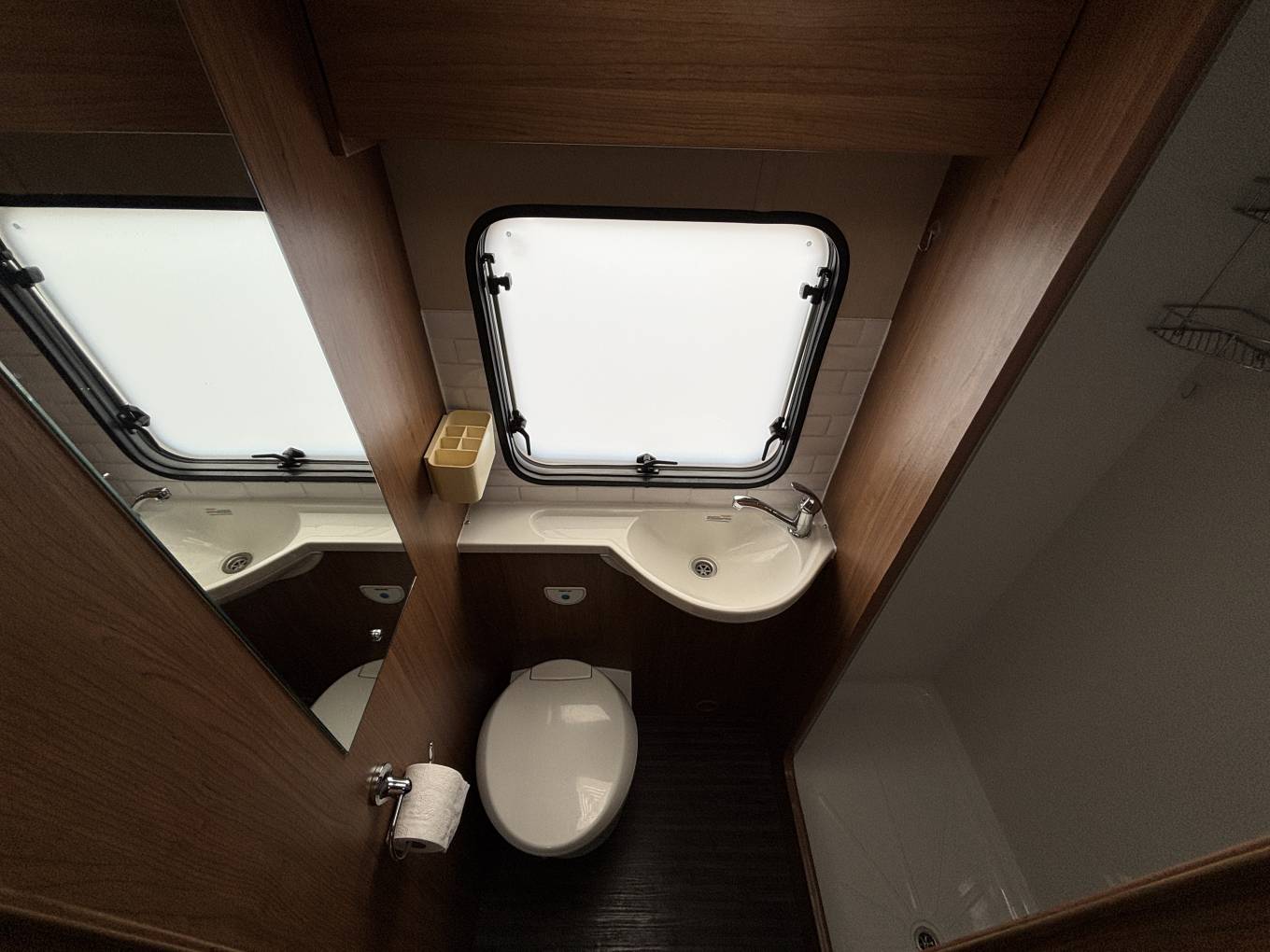 Opposite is the washroom with wash hand basin and vanity unit, cassette toilet with electric flush and a good sized separate shower.