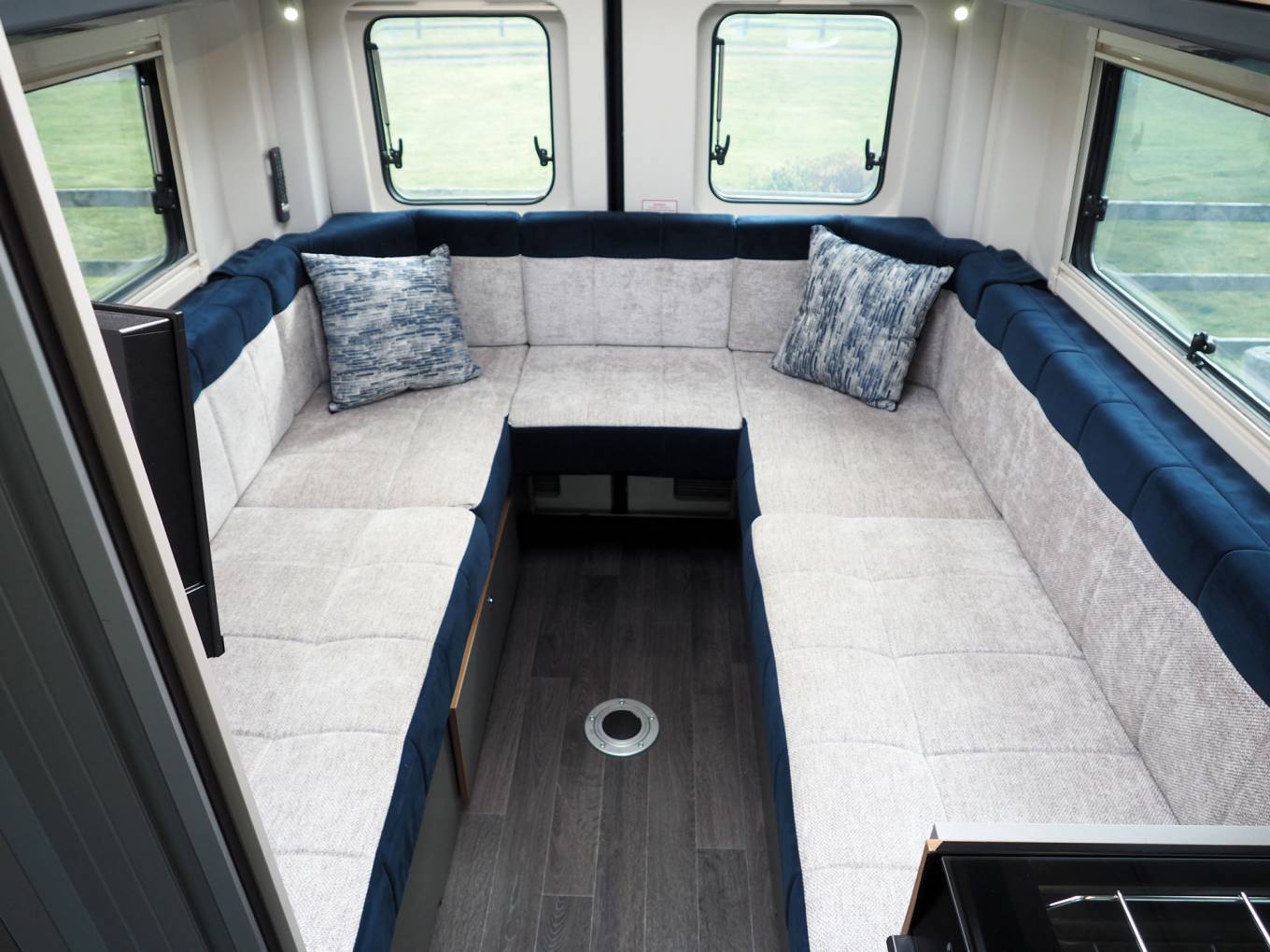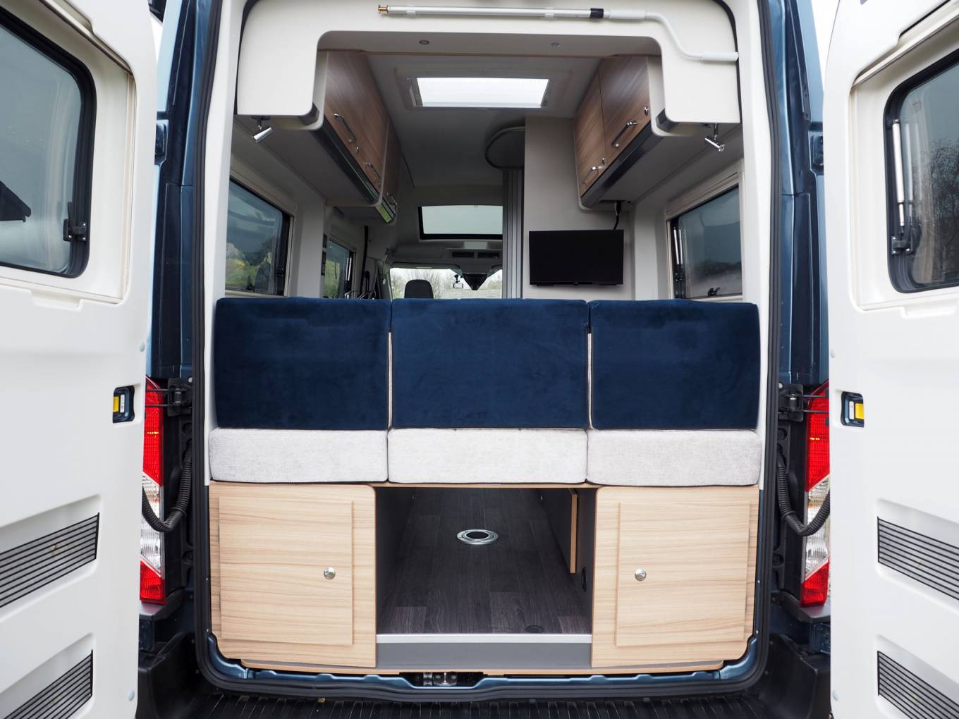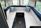 Utilising the classic rear U lounge layout for maximum relaxing space within its 6 metre footprint, the Bailey features a clever washroom partition to increase aisle space and offer a good sized shower. The interior is light and well planned, with copious storage, some of which can be accessed from the rear doors, which incidentally have opening windows. The spacious rear lounge can be used as twin single beds or converted into a huge double and there is through storage from the rear for long items.