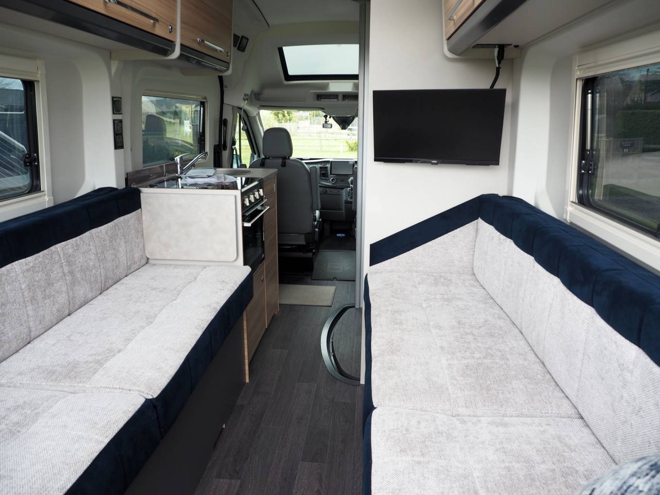 Domestic facilities are to a high standard including fresh and waste water tanks, Truma dual fuel heating and hot water, full kitchen with gas hob, oven and grill, generous fridge freezer, washroom with vanity sink, toilet and shower. Full electrics are onboard, with upgraded 105AH habitation lithium battery, solar panel and battery optimisation system, so this vehicle is capable of off grid use with confidence.