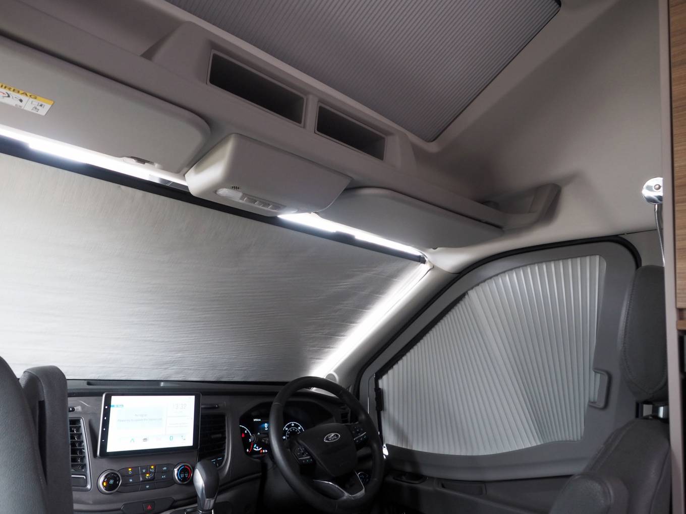 To the front the Ford Transit cab is a comfortable place to be with specification including Android Auto enabled multimedia head unit with rear view camera, cab air conditioning, cruise control, side window, cab sunroof and front screen privacy blinds. With 155bhp on tap through the fully automatic gearbox, progress is refined with plenty of power.