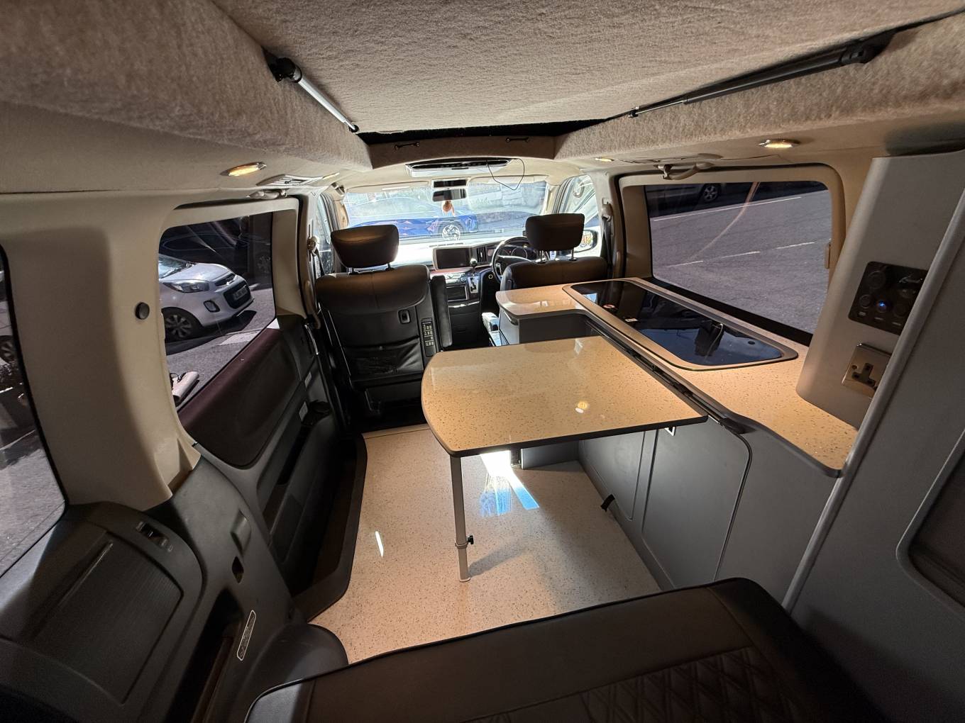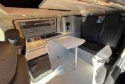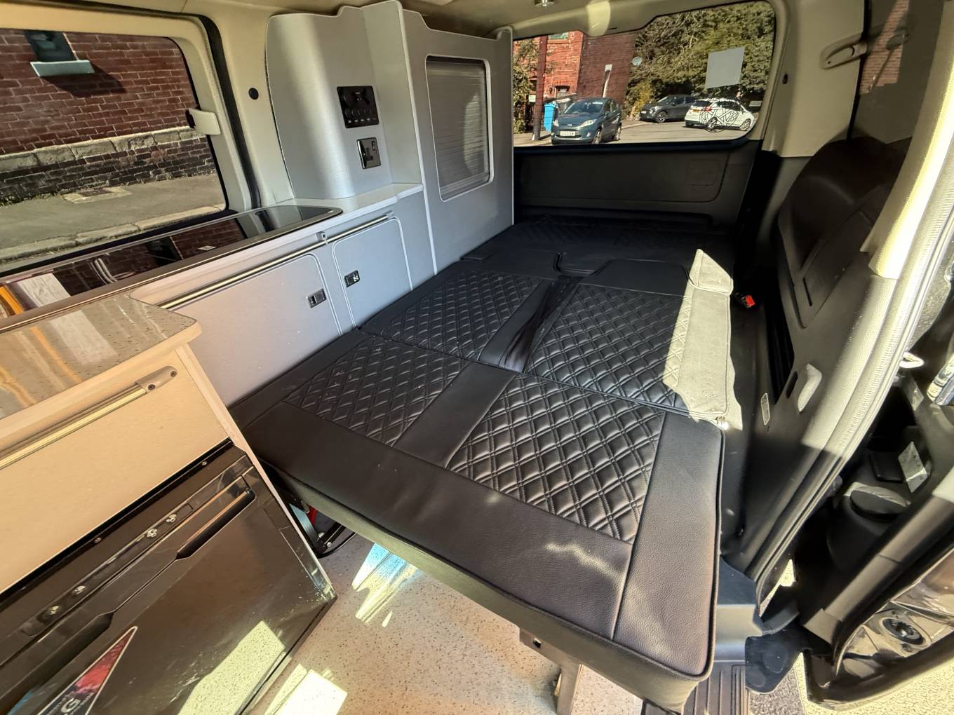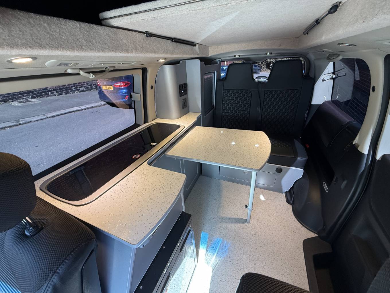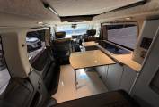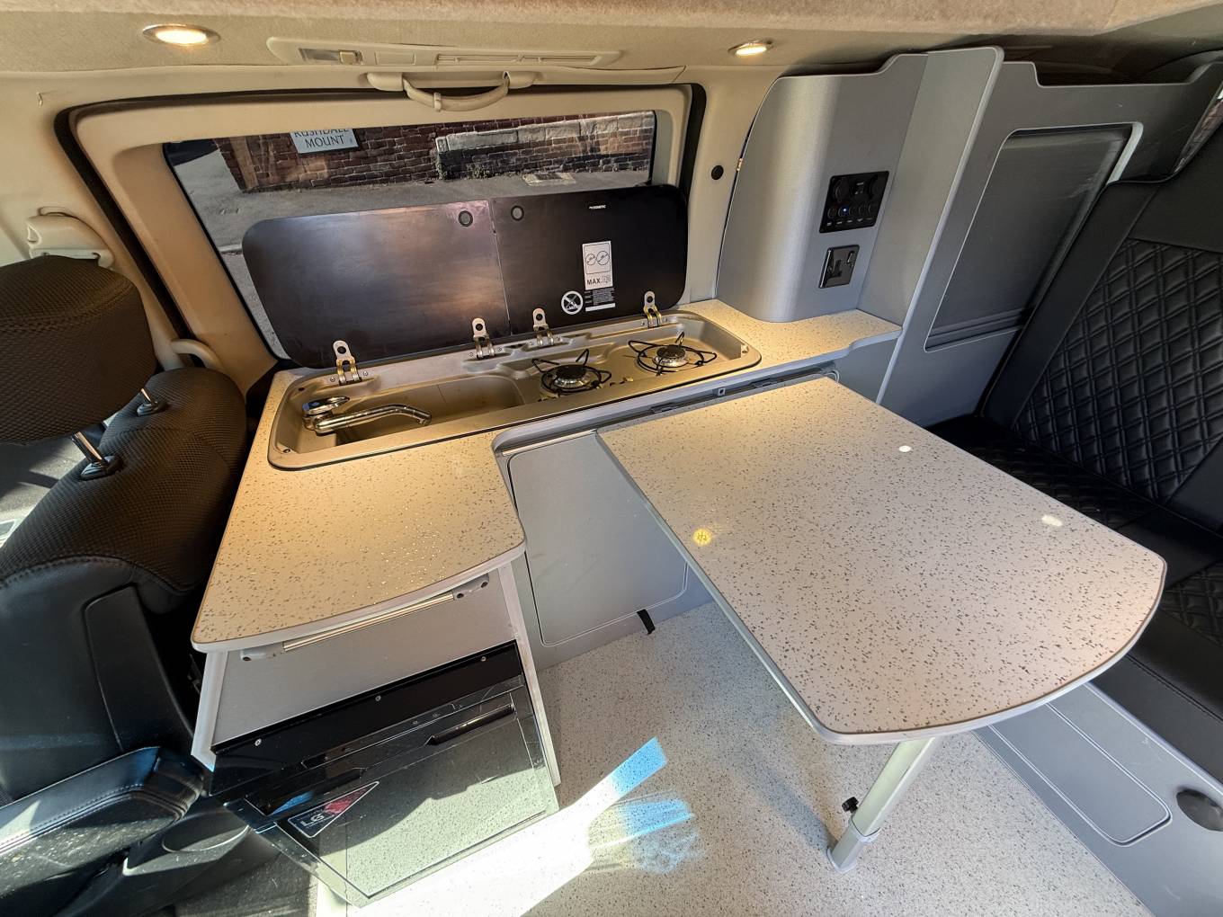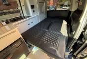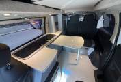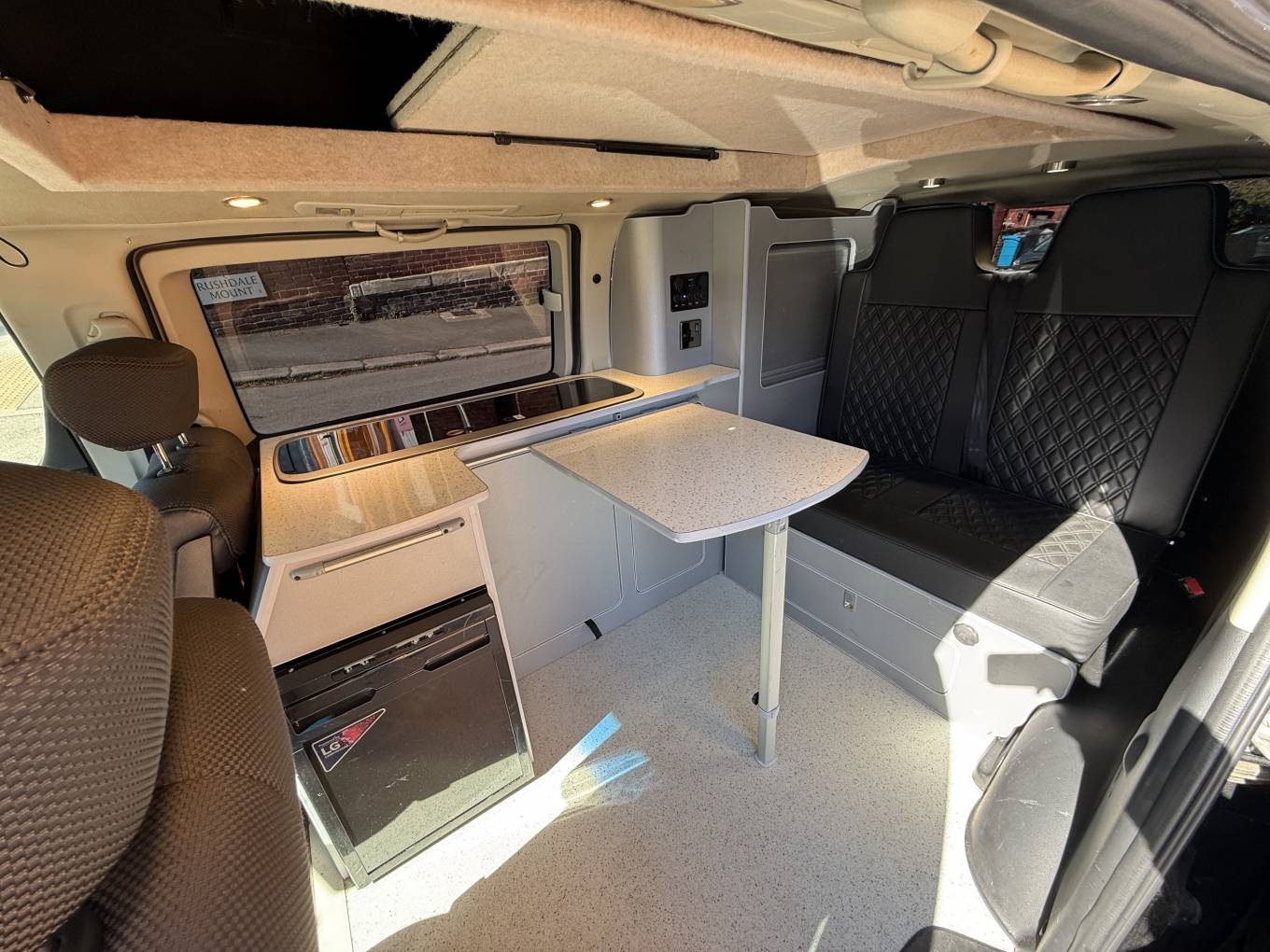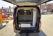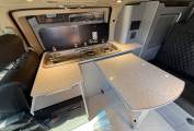 Entering through the side door we are greeted by the attractive interior with stylish grey units complimented by black seats and accessories. There is an abundance of storage along with a Dometic combination double hob and sink and a compressor fridge. The rock and roll bed features two additional 3 point seatbelts and also creates a comfortable double bed. You will find the second sleeping area in the pop top roof.